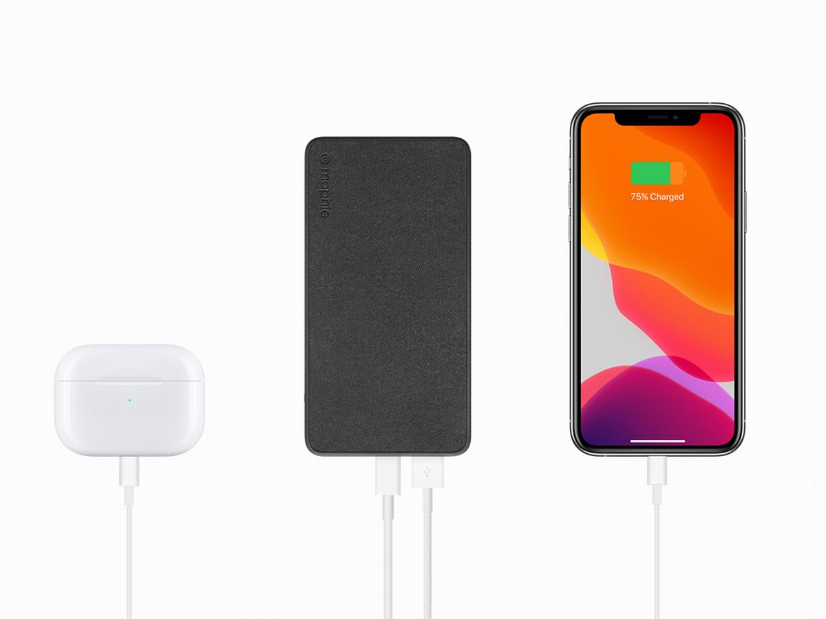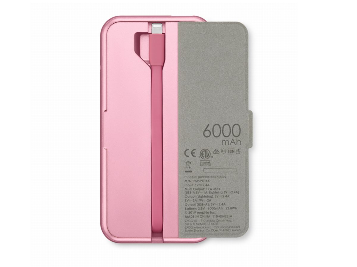 mophie powerstation plus 通用电池 (6000 毫安)是一款多功能移动电源,内置6000mAh锂离子电池,带有一个USB-A输出口,一个Lightning输入口。底部蒙皮掀起后可以看到自带一根Lightning快充线缆, 用户外出无需额外携带数据线,可直接对iPhone提供18W PD快充,最多支持两台设备同时充电。售价为648元人民币,有粉色、海军蓝、灰色、黑色四种颜色可选。
