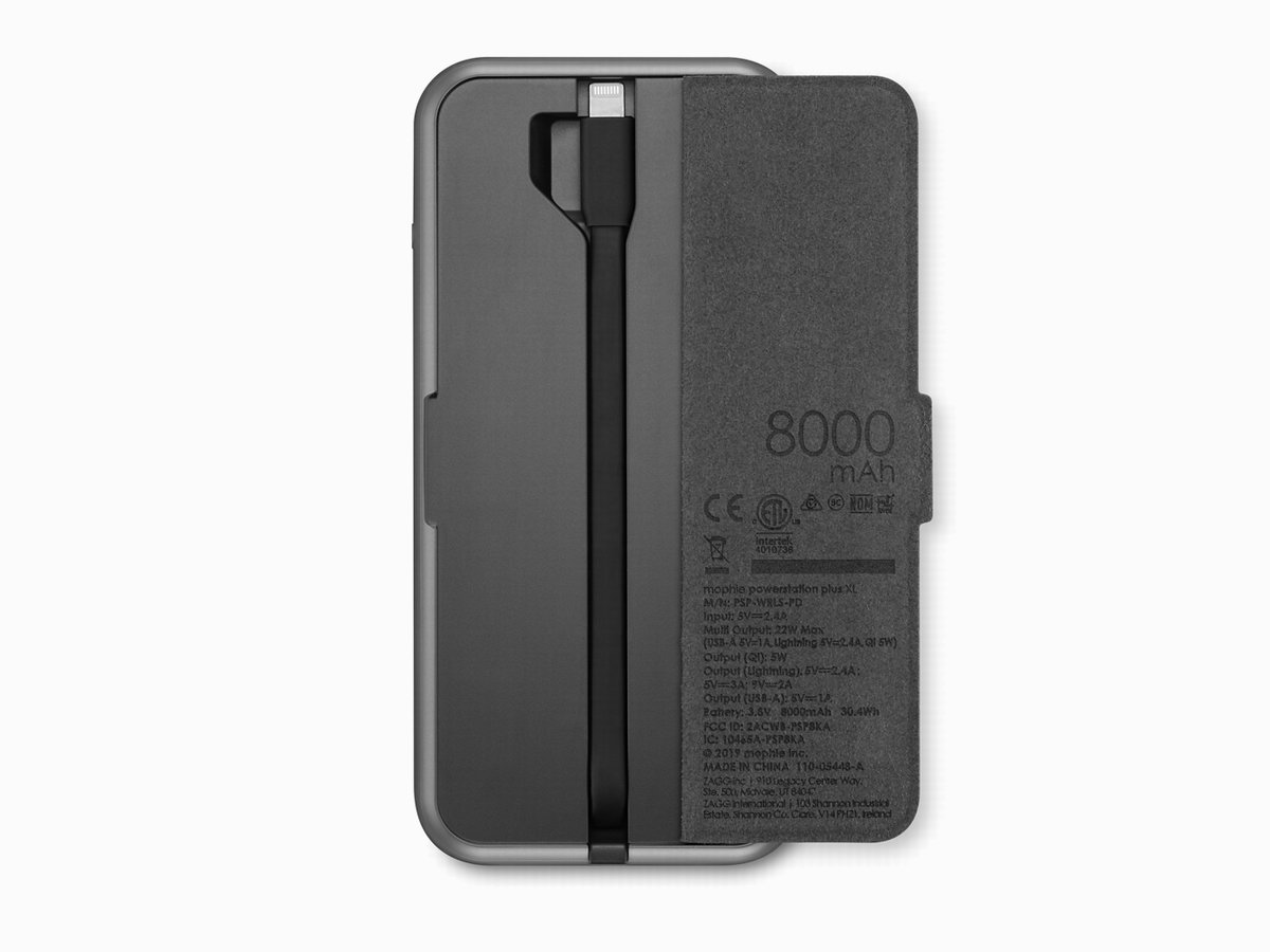 mophie powerstation plus wireless 8K PD 通用电池是一款多功能移动电源,内置8000mAh锂离子电池,带有一个USB-A输出口,一个Lightning输入口。底部蒙皮掀起后可以看到自带一根Lightning快充线缆, 用户外出无需额外携带数据线,可直接对iPhone提供18W PD快充。移动电源的另一个表面内置无线充电区域,支持Qi无线充电标准,最多支持三设备同时充电。售价为798元人民币,蓝、黑两种颜色可选。
