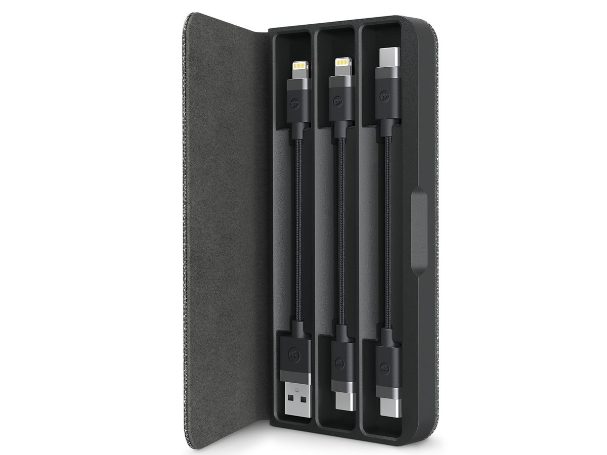 mophie 线缆套件带有一个布艺与塑料制成的精美收纳盒,内含三根数据短线,方便用户出行使用。三根数据短线分别是USB-A to Lightning数据线、USB-C to Lightning数据线、USB-C to USB-C数据线,覆盖了目前主流数码设备的连接需求,支持充电与数据传输。售价为398元人民币。