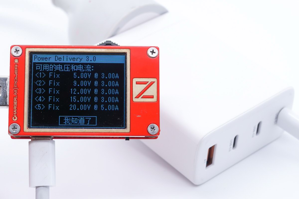 使用POWER-Z KT002 USB测试仪读取USB-C1 PDO报文,支持5V3A / 9V3A / 12V3A / 15V3A / 20V5A五个固定电压输出档。