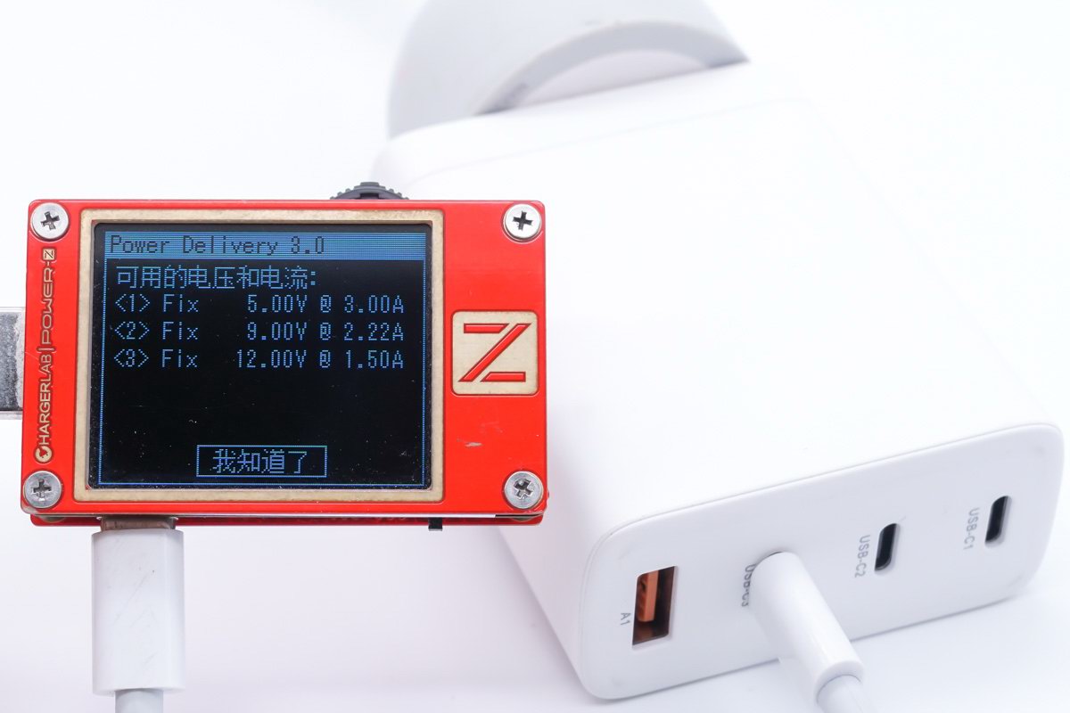 使用POWER-Z KT002 USB测试仪读取USB-C3 PDO报文,支持5V3A / 9V2.22A / 12V1.5A三个固定电压输出档。