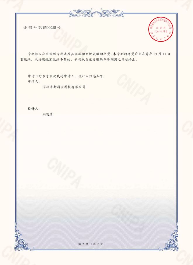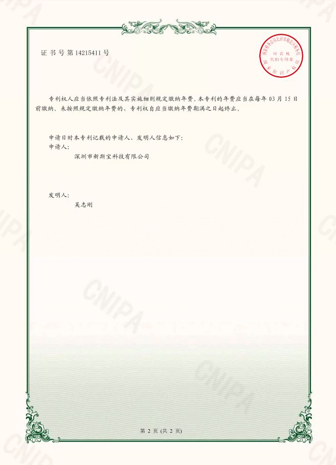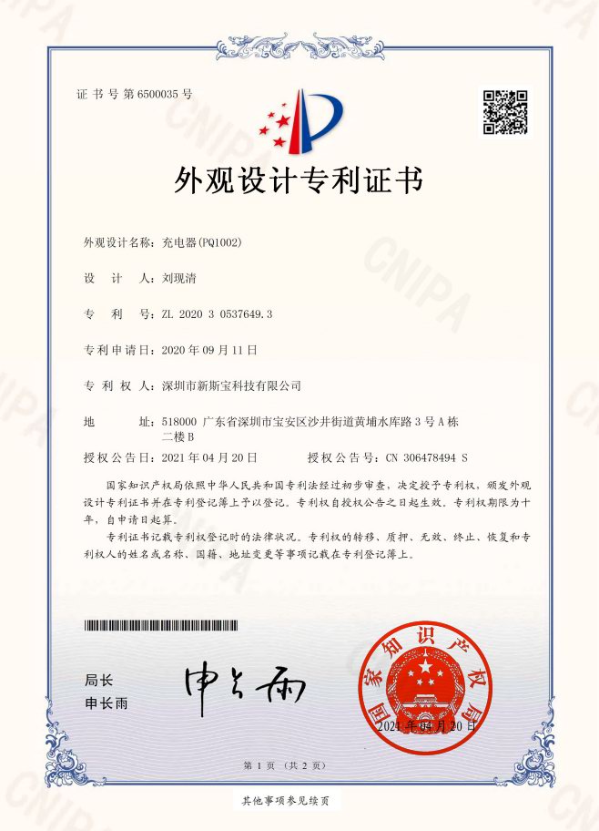 新斯宝100W 3C1A充电器已获得国家知识产权局颁发专利证书,外观专利证书,编号6500035、实用新型专利证书,编号:14215411号。