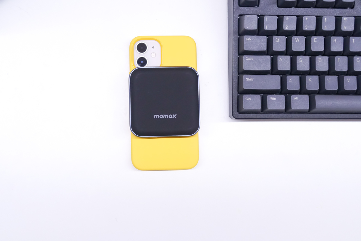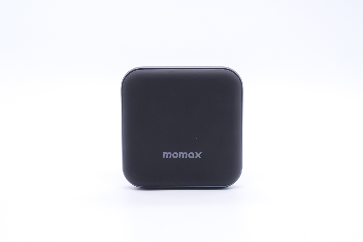 这就是MOMAX摩米士推出的超迷你磁吸无线充电宝,正面仅有MOMAX摩米士的品牌Logo。