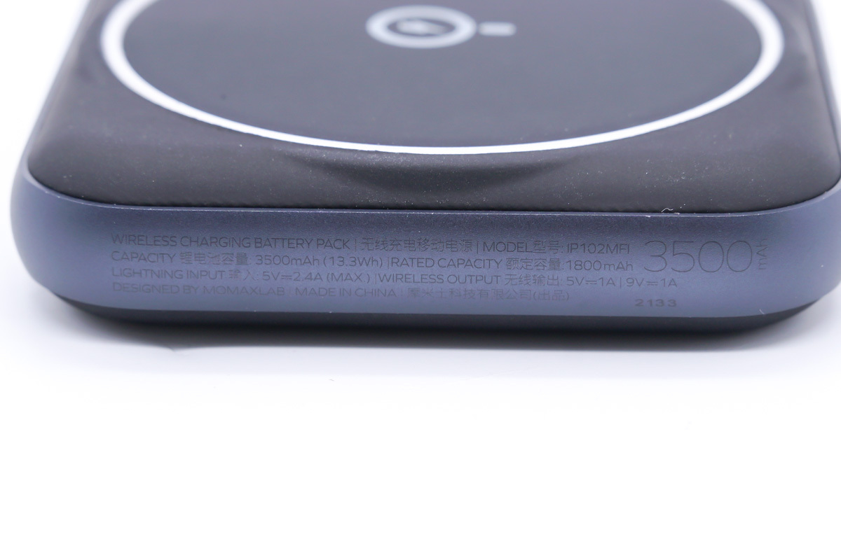 MOMAX摩米士超迷你磁吸无线充电宝整体采用类似三明治的结构设计,上下使用硅胶仿生皮材质并使用类肤质图层覆盖,中间采用铝合金加固。从侧面标注的信息可以得知充电宝支持10W的无线充电功率。
