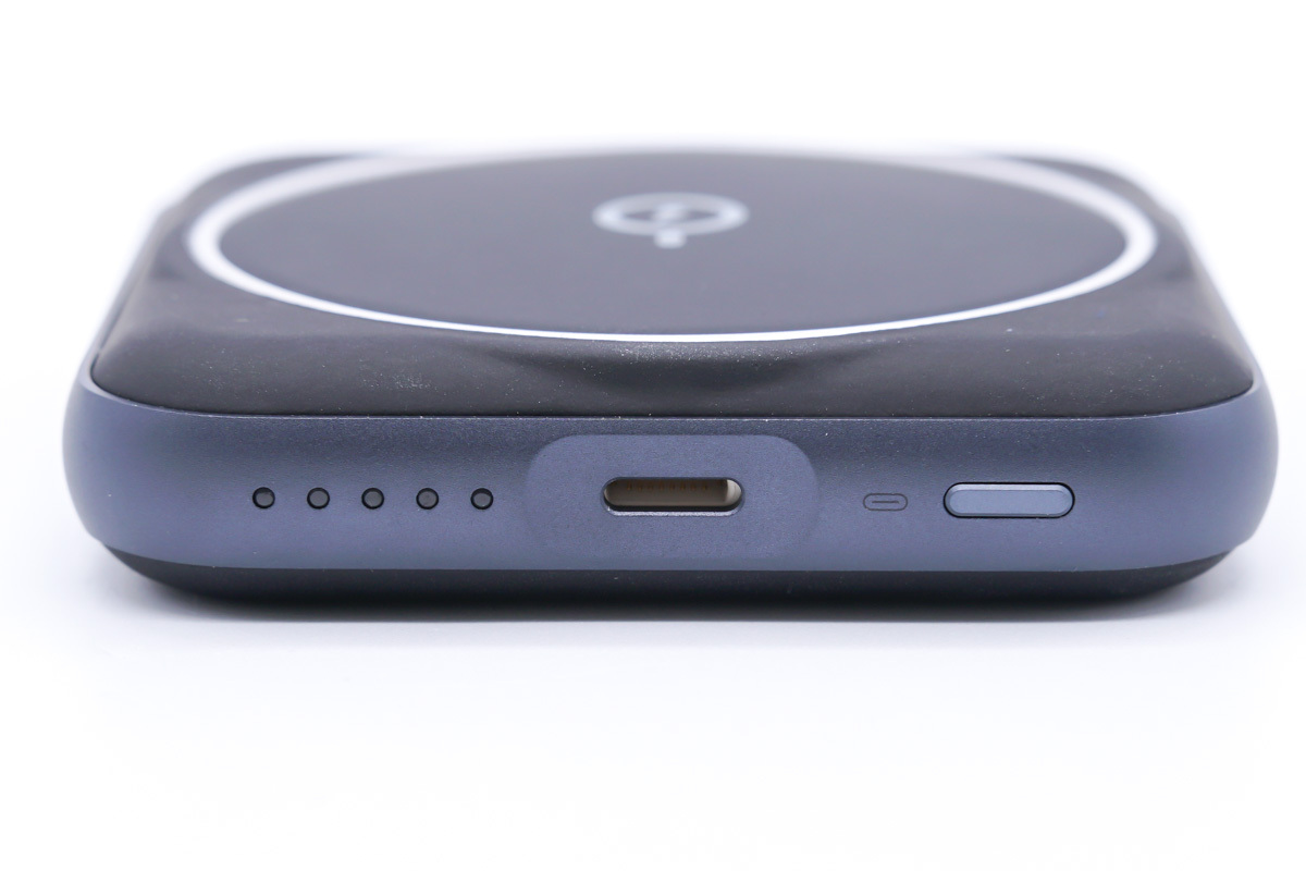 左侧设有五颗指示灯,其中四颗指示灯承担着电量显示的任务,最左侧的指示灯为无线输出指示灯,红色指示灯亮起,代表开启无线充电。
