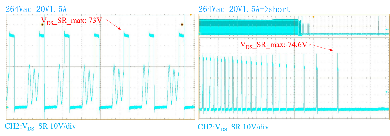 专利软驱技术, 即使在264V AC输入,各种工况下,VDS_SR最大尖峰电压仅为74.6V,采用100V 或 80V MOSFET足以应对各种工作状态: