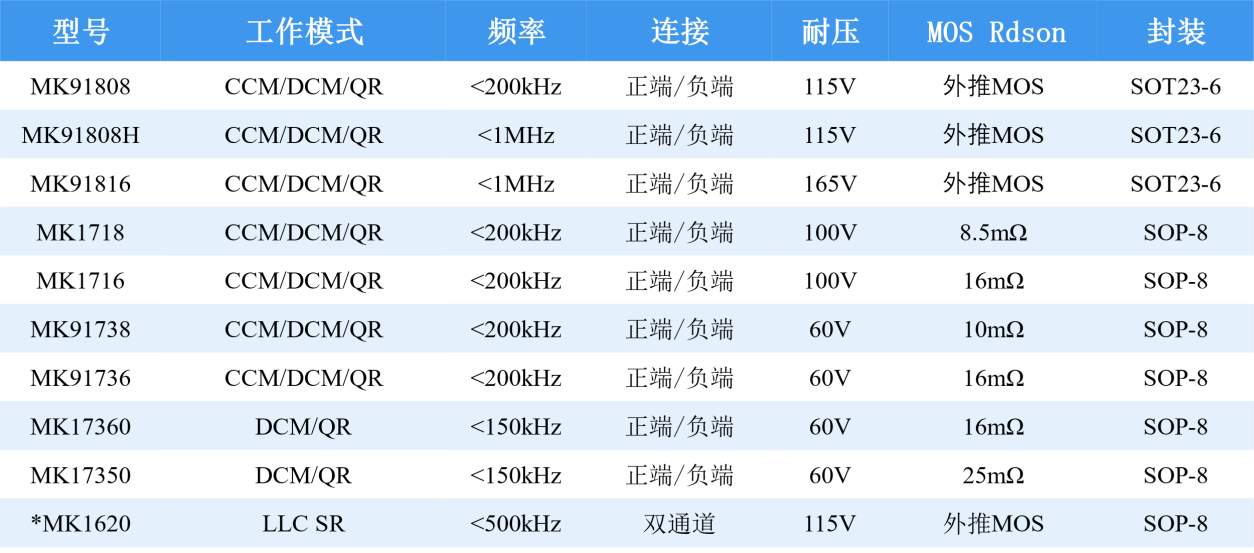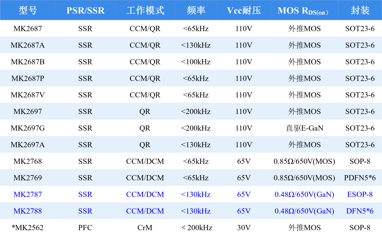 茂睿芯年初发布了业界最小体积SOT23-6的高频QR ACDC PWM产品:MK2697/MK2697G,其中MK2697外驱MOSFET(SJ MOS,超级硅等),MK2697G直驱E-GaN。搭配业界最全的同步整流产品, 茂睿芯为客户提供全套高频高效的快充解决方案,累计近100家客户选用了茂睿芯的氮化镓解决方案。