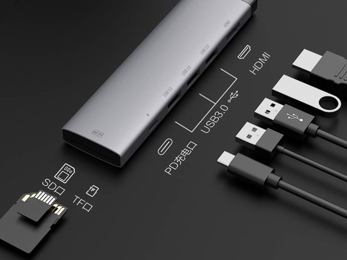 米物七合一多功能扩展坞带有一个TF读卡器、一个SD读卡器、一个USB-C双向接口、两个USB-A数据接口、一个HDMI视频接口。