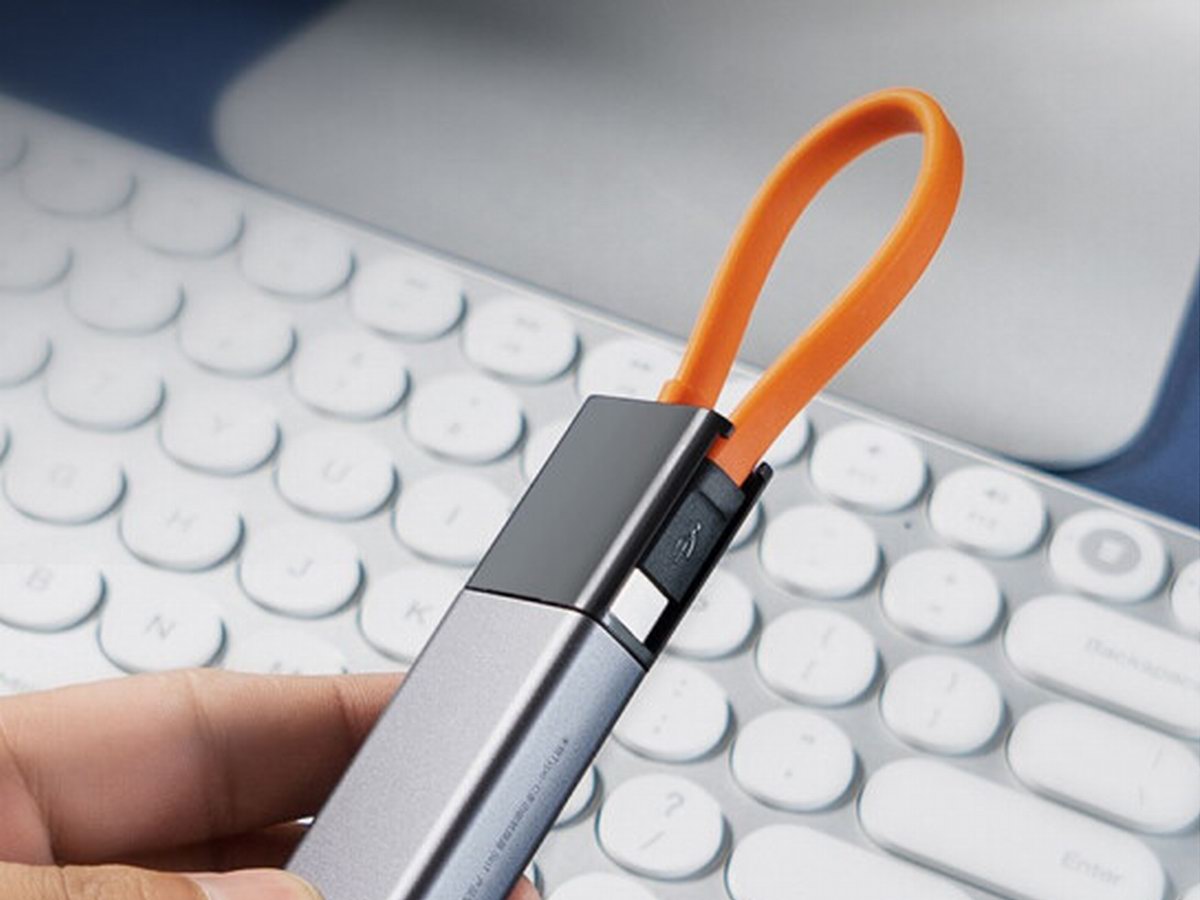 与笔记本连接端口是一根扁平十分醒目的桔色面条线,接头类型为USB-C,机身上带有凹槽与卡扣,外带时方便插头收纳,全面兼容windows、macOS等设备使用。