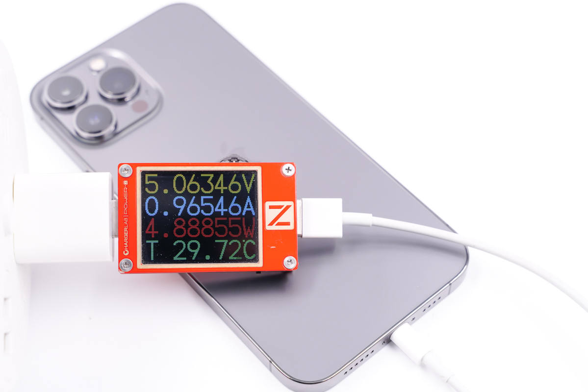 首先使用苹果经典的5W充电器为iPhone 13 Pro Max充电,功率为5.06V 0.96A 4.88W,意料之中的可以跑满功率,相信很多用户只要想找,总会在家里的某个角落找出一个苹果5W充电器来。