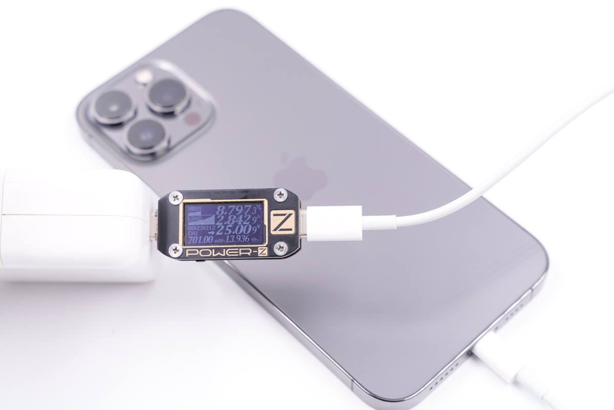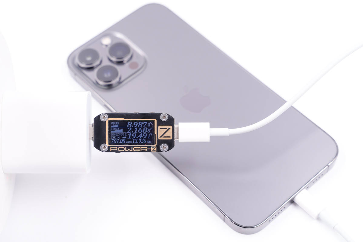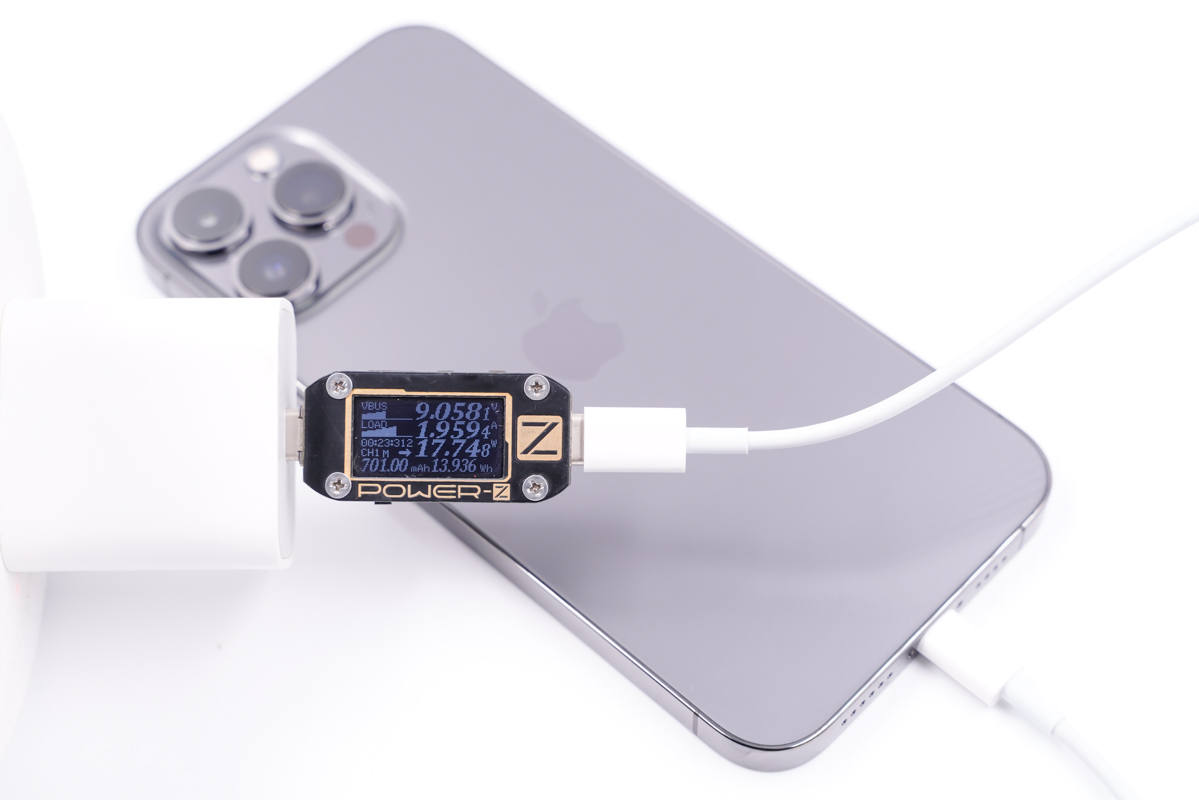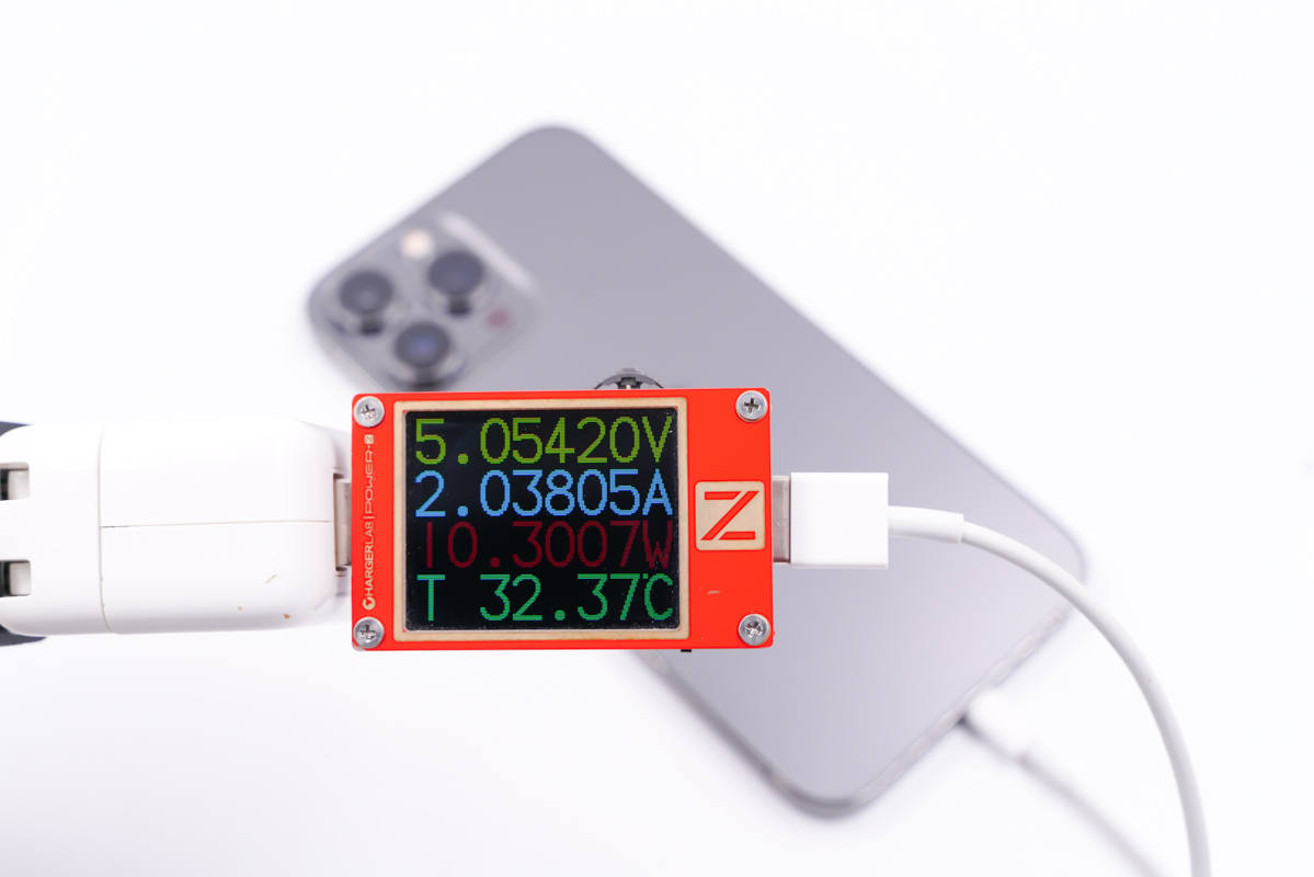 苹果20W PD充电器最初于2020年iPad Air 4发布会上亮相,支持9V2.22A 20W PD快充,使用充电器为iPhone 13 Pro Max充电,功率为8.98V 2.16A 19.49W。