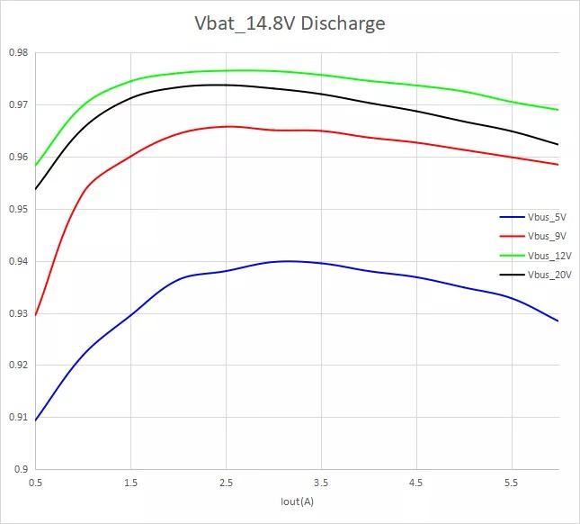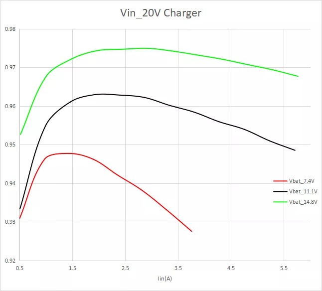 当电池电压为14.8V也就是4串电池时,12V或20V输出的整体效率都很高,以12V输出的最高效率超过了97.5%,以20V输出的效率也达到了97%以上。
