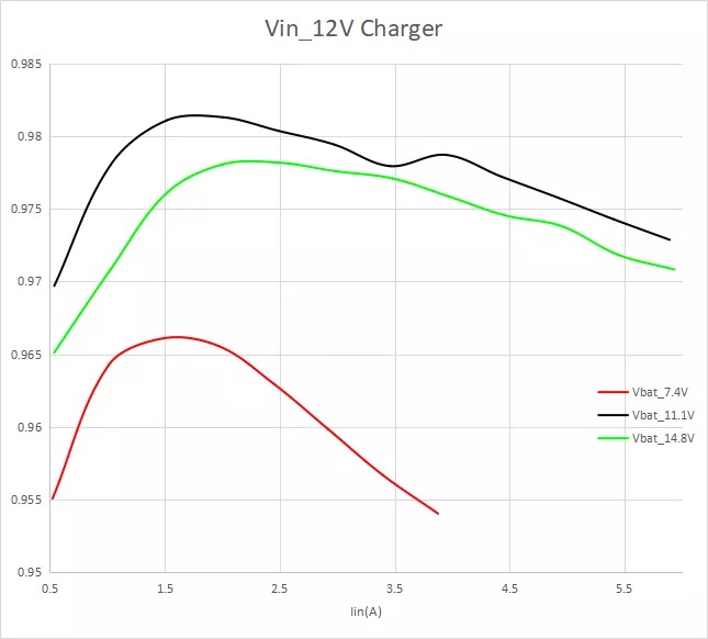 当以12V电压充电时,3串电芯和4串电芯的效率优势比较明显,峰值效率均在1.5-2.5A电流之间,其中3串电芯的最高效率超过了98%。