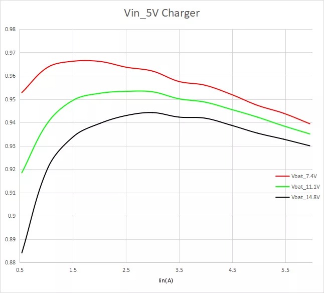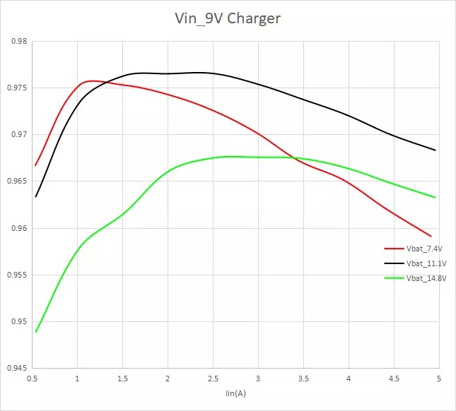 当以9V电压充电时,2串电芯的峰值效率在1-1.5A电流之间,3串电芯的峰值效率在1.5-2.5A之间,4串电芯的峰值效率在2.5-3.5A之间。