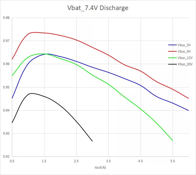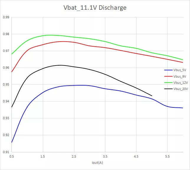 当搭配3串电池使用时,以12V电压输出的效率最高,峰值接近98%;5V输出的整体效率相对其它电压档位略低。