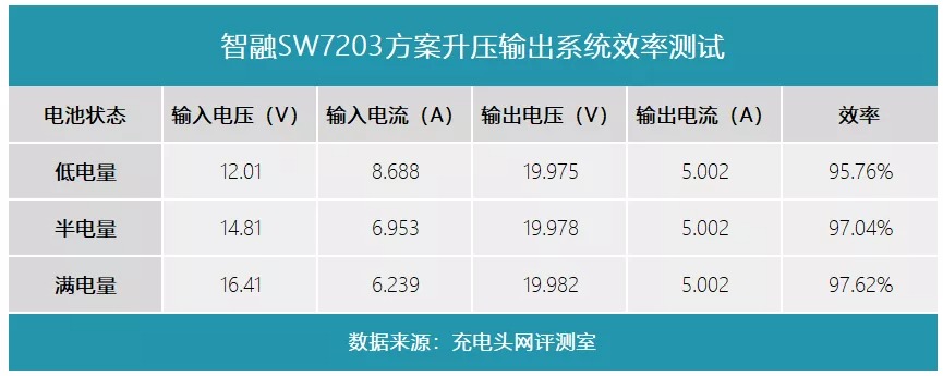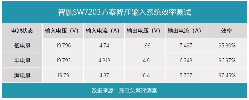 智融SW7203 DEMO在降压输入给电池充电时,即使电池处于低电量状态,板子的系统效率仍在95%以上,而当电池处于满电状态时,效率更是高达97.45%。高效率意味着低发热,这也是开发100W大功率移动电源或车充的必要条件。