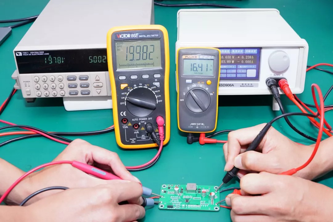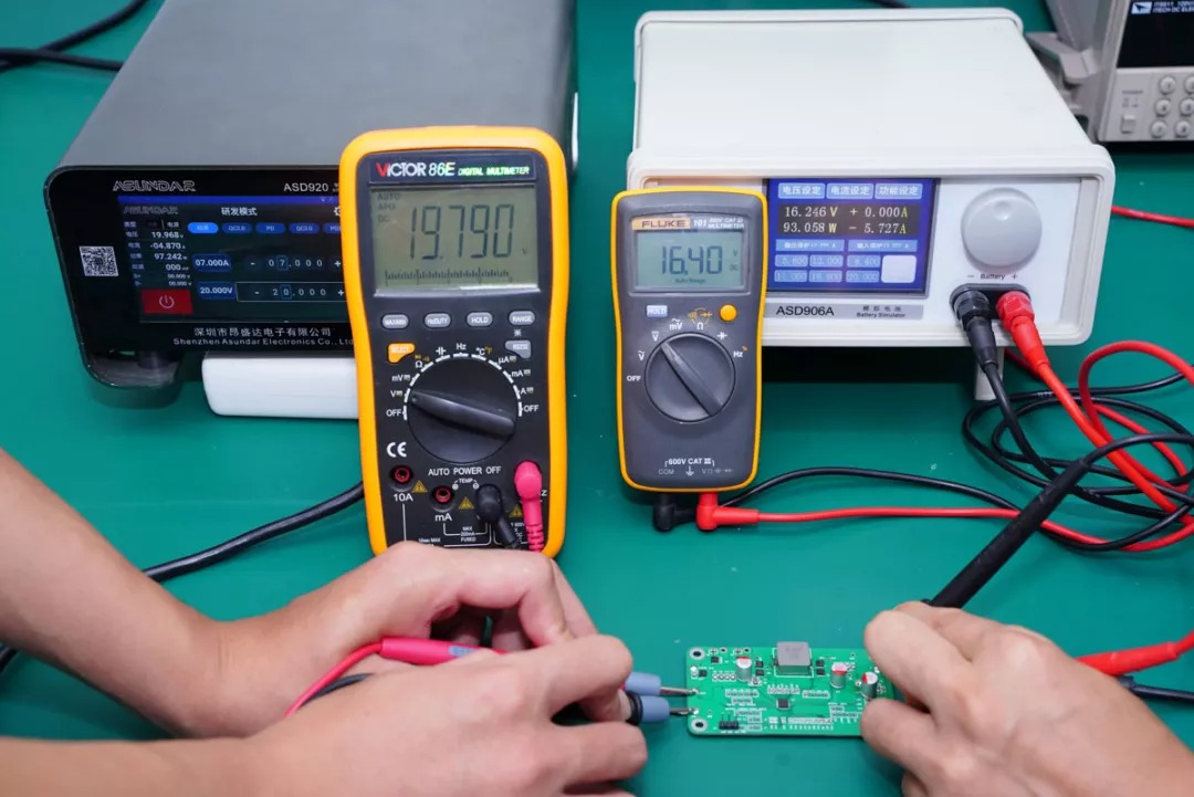 模拟电池满电的情况下测试,板端输入电压为16.41V,输入电流为6.239A,板端输出电压为19.982V,输出电流为5.002A,板端转换效率为97.62%。