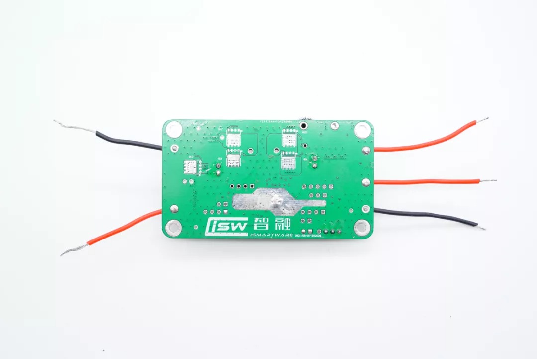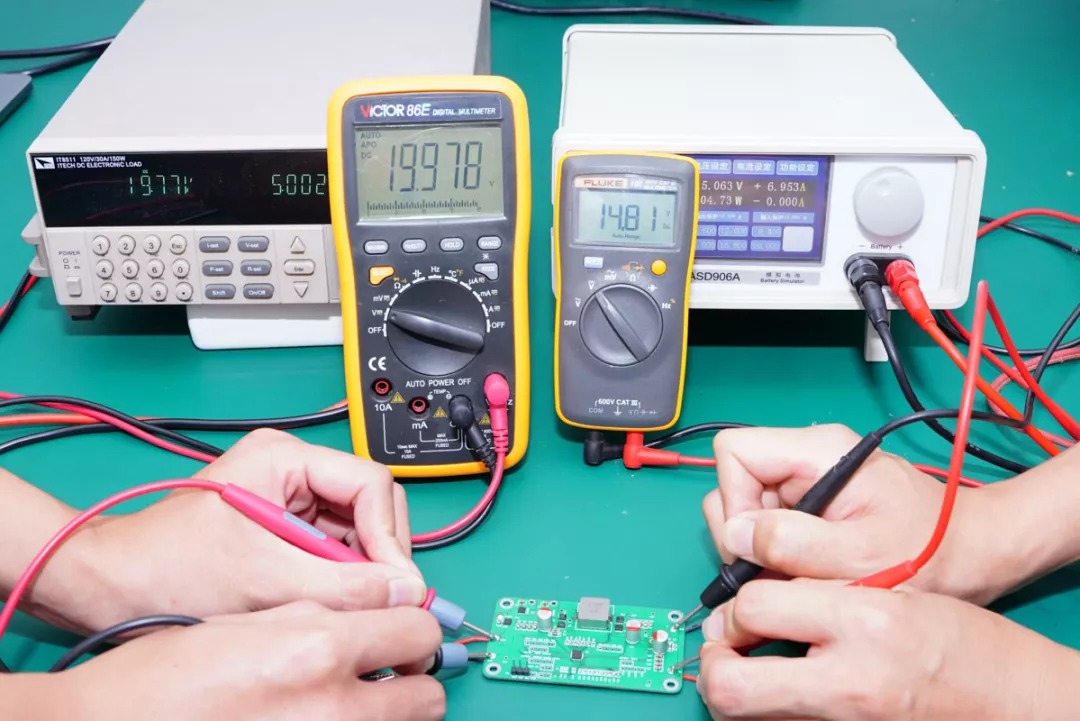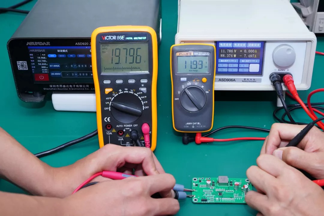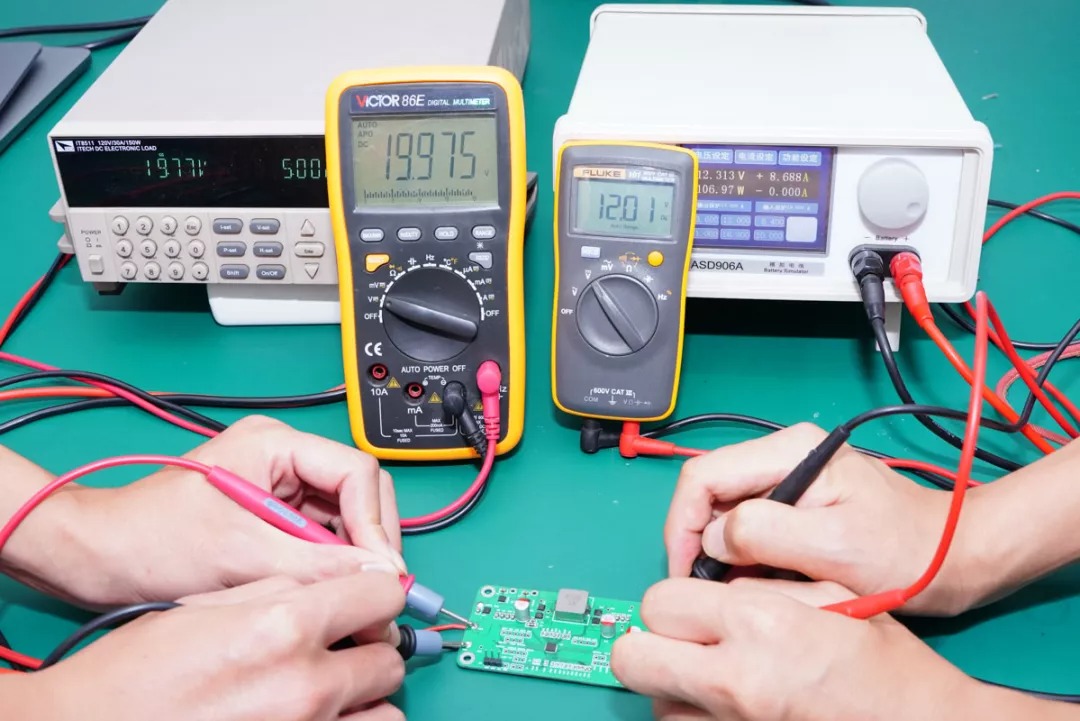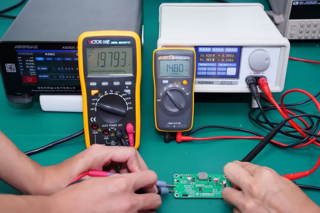 模拟电池低电量的情况下测试,板端输入电压为19.796V,输入电流为4.74A,板端输出电压为11.99V,输出电流为7.497A,板端转换效率为95.80%。