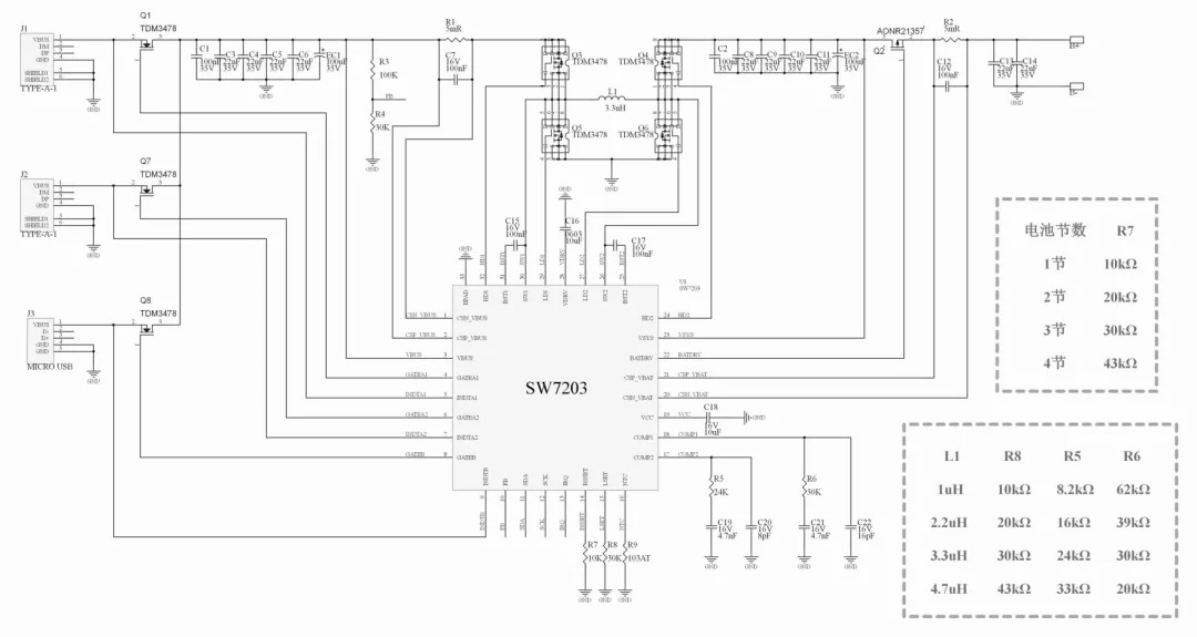 图为智融SW7203同步升降压控制器参考设计,内置了一路输入检测和两路输出检测,及对应的通路驱动,专为PD大功率快充而设计,搭配内置协议功能的MCU即可组成完整的双向大功率快充方案。