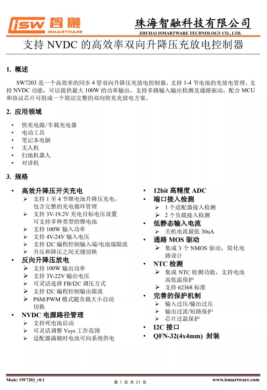 以高集成电源SoC闻名的智融科技,在快充移动电源和USB PD快充上推出的集成PD及常用快充协议的电源芯片,很受市场欢迎,市场占有率非常高。智融最新推出了一款同步升降压控制器SW7203,是一款双向升降压控制器,支持1到4节锂电池充放电管理,集成路径管理NVDC,支持最大100W输出功率。