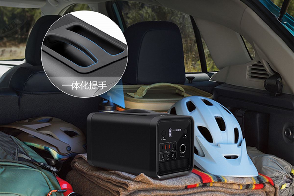 公牛600W户外电源整体采用炫酷的黑色外观设计,机身主体结构采用铝合金壳体制作,边缘防磕碰材质底部加入了橡胶防滑垫避免滑动,顶部提手方便用户携带。前后接口面板采用亮面亚克力制作,并开设了通风孔与内部主动风扇组成散热系统,保证长时间运行的稳定性。