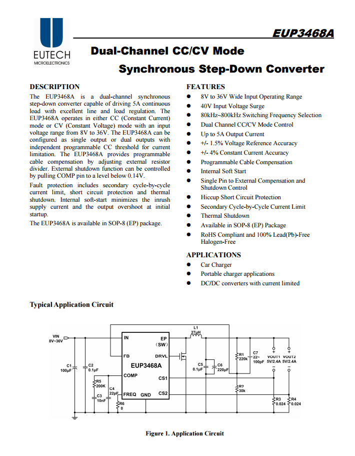 EUP 3468A是一颗双通道同步降压芯片,能够支持5A负载输出。工作电压范围在8V-36V,支持恒流(CC)和恒压(CV)工作模式。同时具有压降补偿功能,可通过将COMP引脚的电压下拉到0.14V实现自动关断。内部软启动能最大限度地减少浪涌电流和启动时过载。