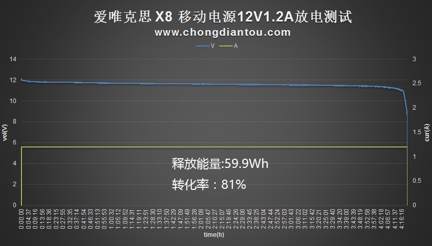 最后设置电流以1.2A输出,电压自动调整至12V,输出依然保持功率14W左右,释放能量59.9Wh,转化率81%。