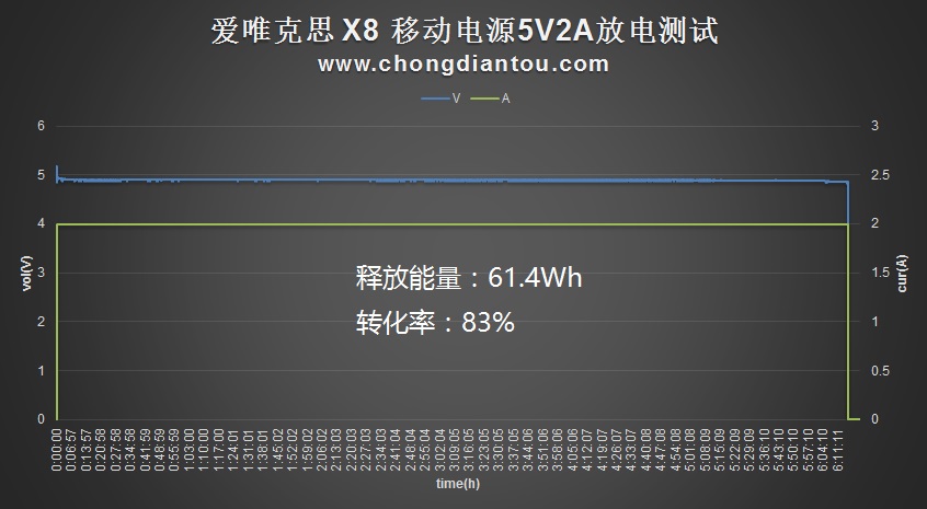2A恒流可持续放电6小时,工作电压为5V。释放能量61.4Wh,转化率83%。