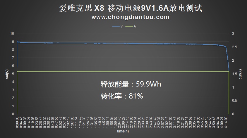 1.6A恒流放电4小时,工作电压9V。释放能量59.9Wh,转化率81%,稍低于前者。