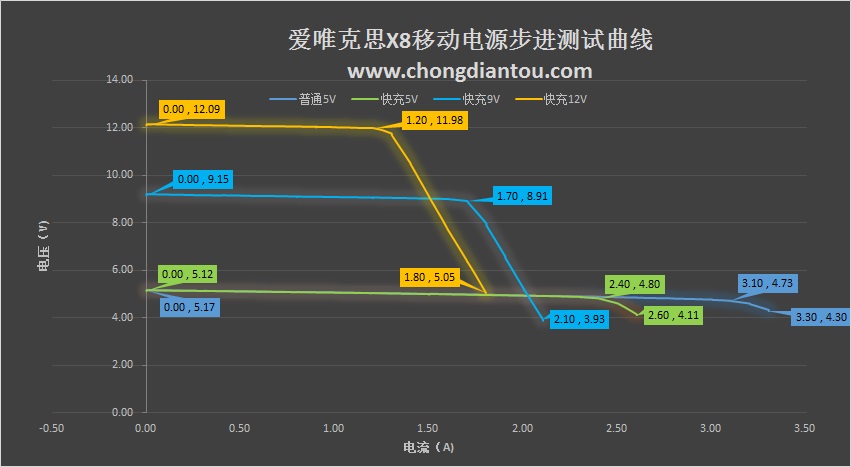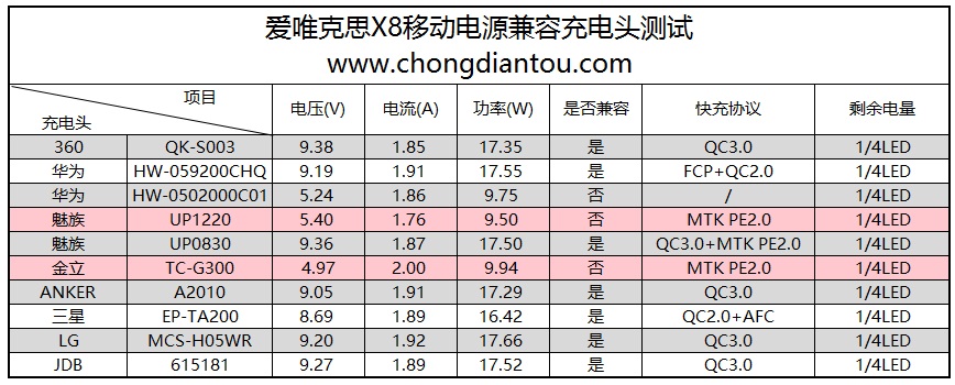 兼容充电头测试中,爱唯克思X8能够识别所有QC系列协议,并且能够迅速握手成功,以最快的速度开启快充。对非QC范围内的两款MTK PE充电头(红色)和一款无协议的普通充电头(青色),表现出爱莫能助,不过,从非快充设备的角度看,10W的输入功率还算过的去。