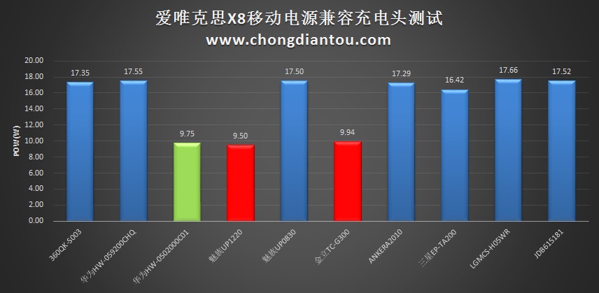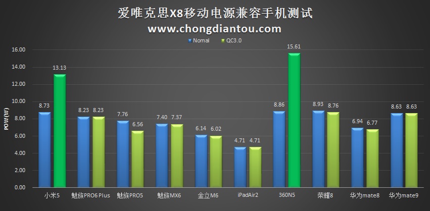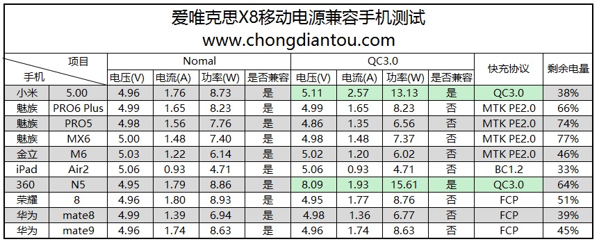 由于小编手头上的测试设备有限,支持QC协议的手机只找到小米5和360N5(绿色标出),从柱状图可以看到,移动电源对这两款快充设备表现出优良的兼容性,功率远超非快充设备。对于未能握手成功的设备,输出功率和普通口不相上下,普遍在7W以上。