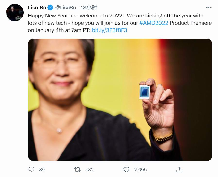 2022年1月4日,AMD CEO苏姿丰在推上放AMD锐龙6000系列处理器无码照,该处理器将在CES 2022展会上正式发布。性能方面,锐龙6000系列采用6nm制程打造,支持DDR5内存,从目前泄露的信息来看,先行首发应该是移动端平台,U系列TDP功耗为28W、H系列TPD为45W, 最高8核16线程,频率最高可达5Ghz。