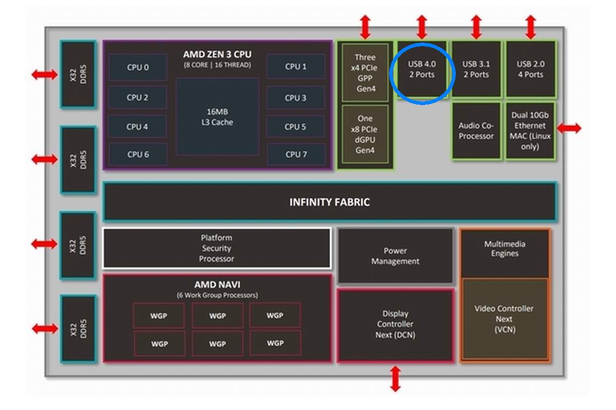 外围方面,右上角可以看到锐龙6000系列原生支持PCIe 4.0 x8显卡、x4外设,满足高性能独立显卡带宽需求,并支持PCIe 4.0高速SSD,还可以看到USB4高速接口。USB-C物理形态的外设接口有多种速率,以前速度最快的当属40Gbps雷电高速接口,但雷电接口是隔壁intel家特有的传家宝,很长一段时间里AMD用户都快馋哭了。