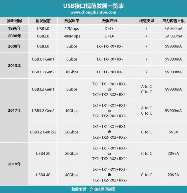 2020年9月初,USB Promoter Group正式发布了USB4,USB4规范使用双链路通道,传输带宽最高达到40Gbps,接口类型为双向USB-C,在充电性能方面更支持100W USB PD快速充电。USB4可以说整合了雷电3,并向下兼容USB3.0和2.0,在性能、兼容性方面都极具优势,并且拥有较高的性价比。