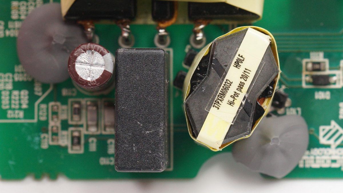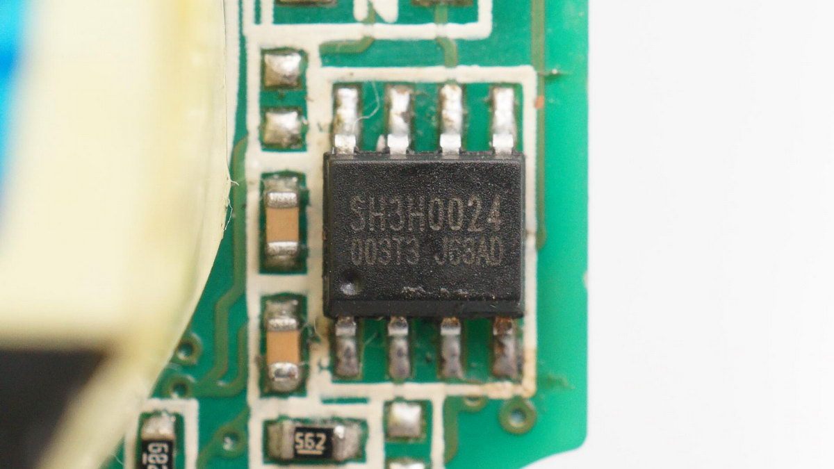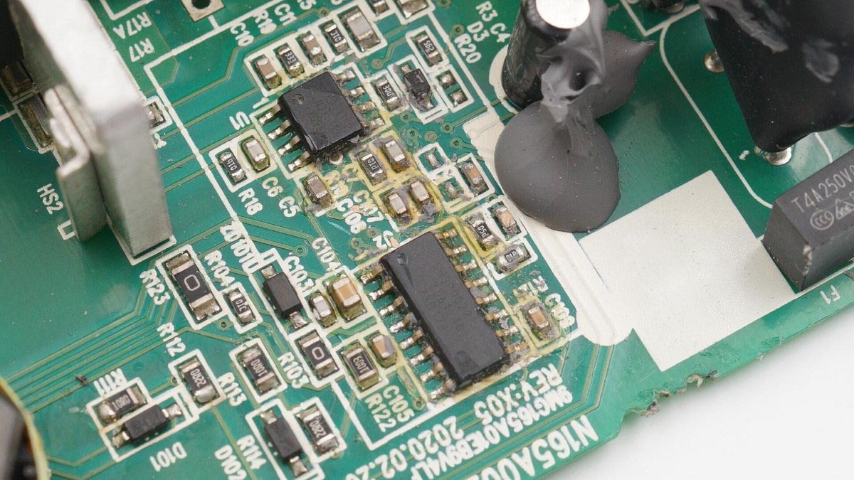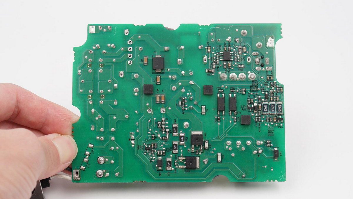 拆掉电容,遮挡区域设有PFC升压控制器和LLC控制器,旁边还有一颗供电小电容。