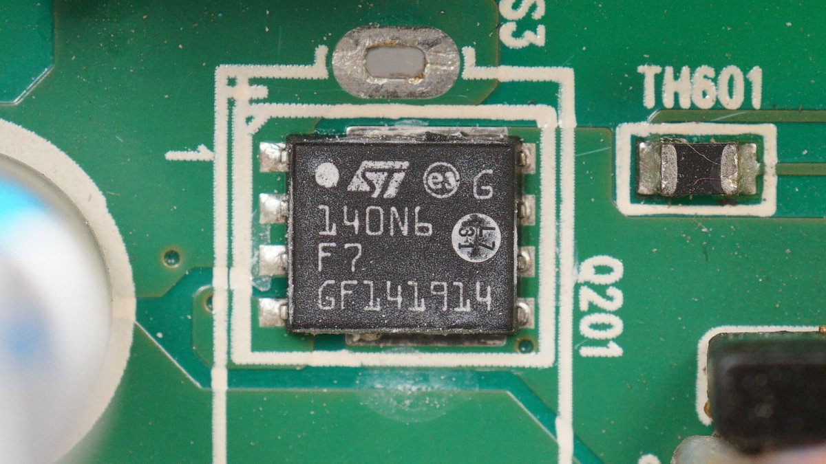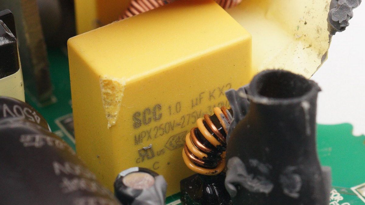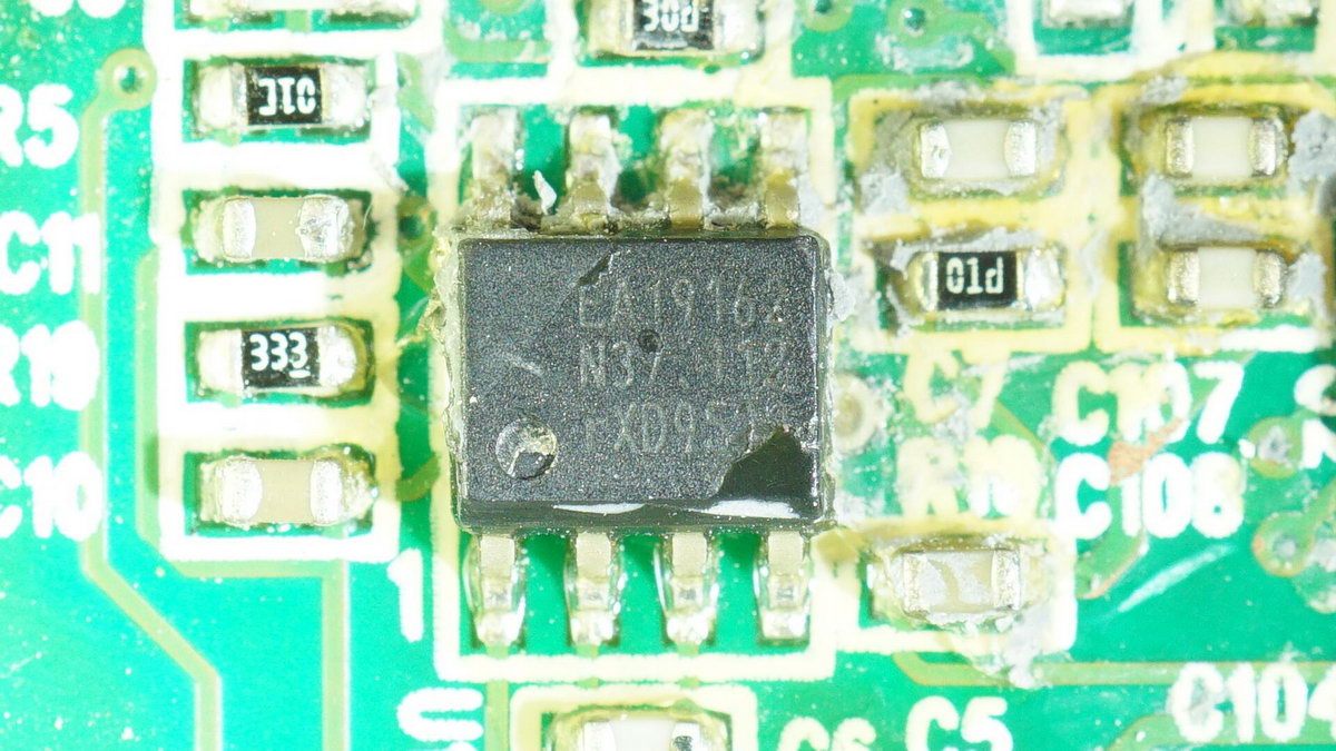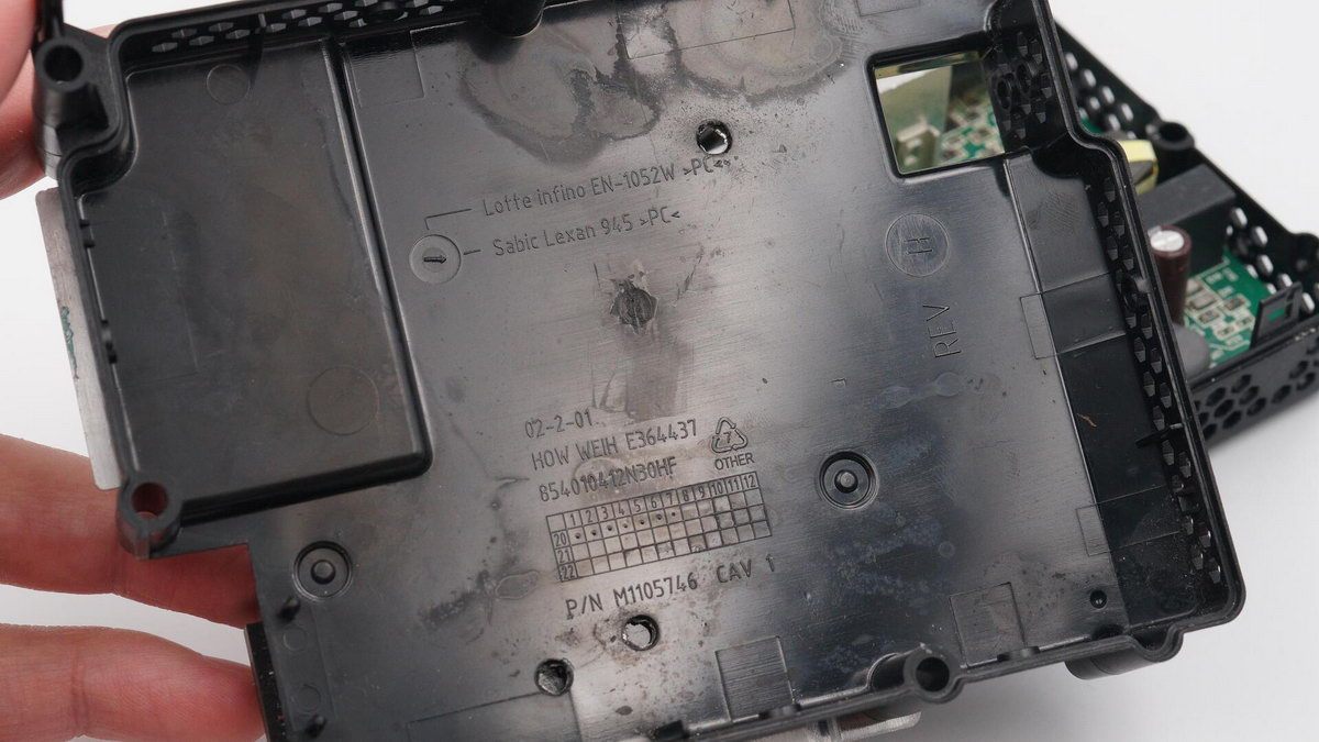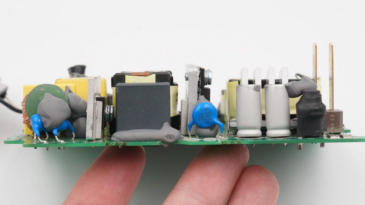 拆掉电容,遮挡区域设有PFC升压控制器和LLC控制器,旁边还有一颗供电小电容。