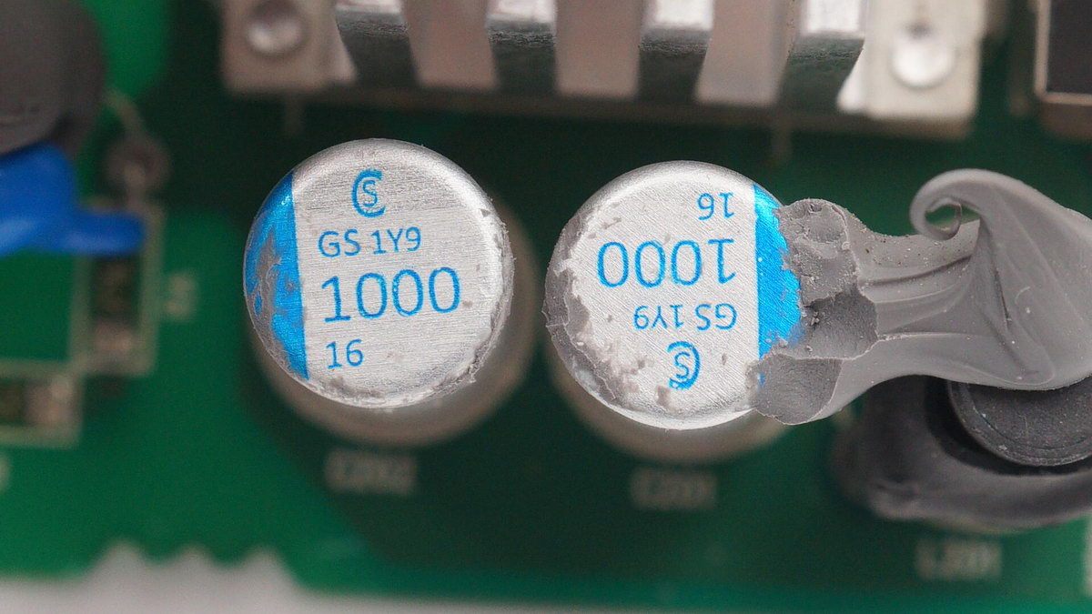 两颗输出滤波固态电容特写,规格为16V 1000μF。