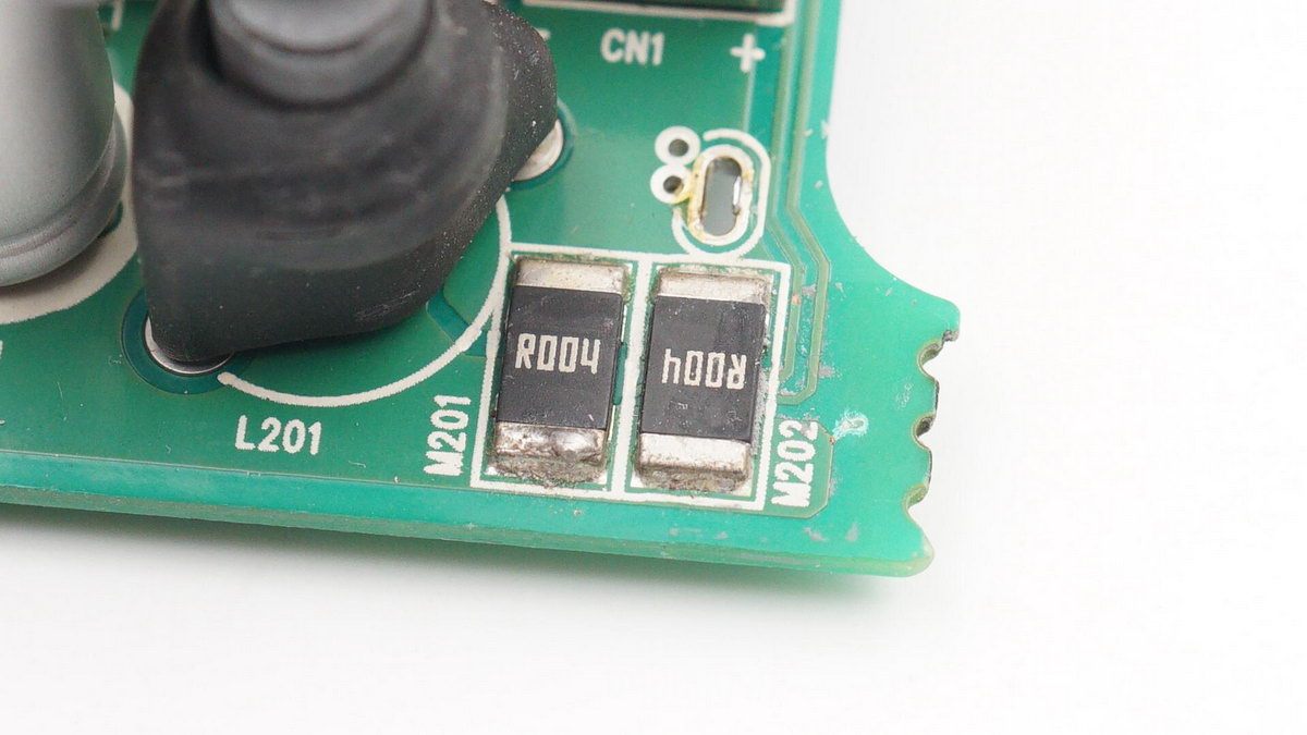 两颗检流电阻特写,用于输出电流检测,进行输出过流保护。
