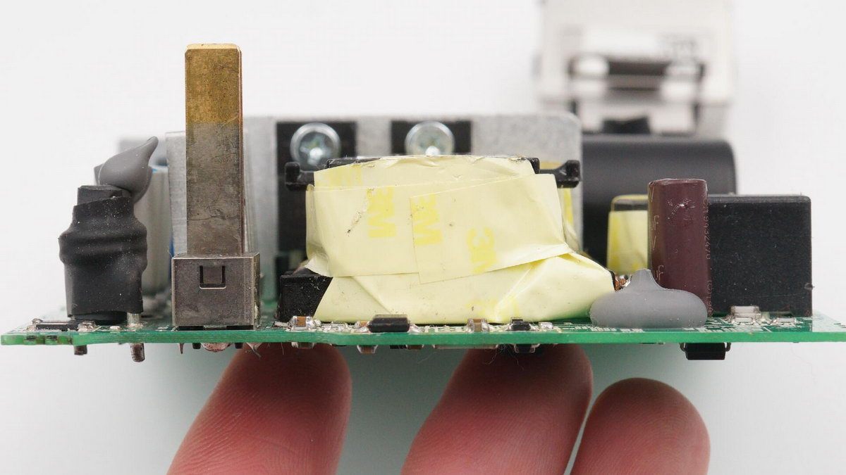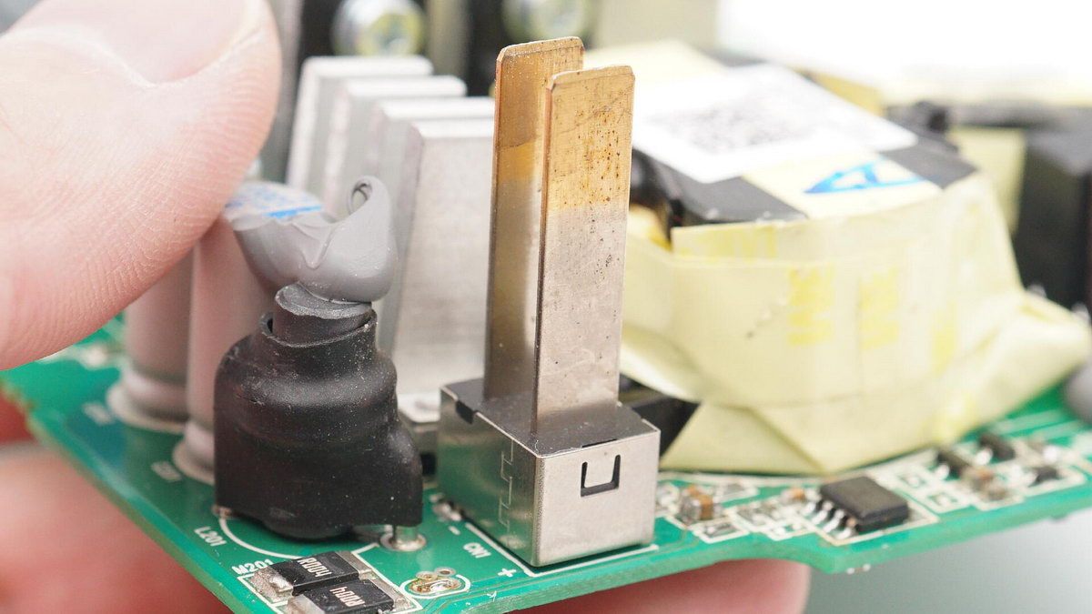 输出端一览,中间设有LLC变压器,左侧滤波电感外套绝缘管,输出插脚上端镀金。