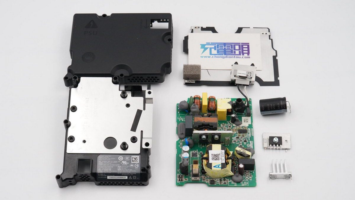从上图也能看到,微软这两款主机造型、体积差别非常大,Xbox Series S显得非常的小巧扁平,自然在如何摆放方面也更加友好。此外配置低了,Xbox Series S的功耗也相对要低很多,配备的电源最大功率为165W,下面我们就一起来看看这款主机的电源用料如何。
