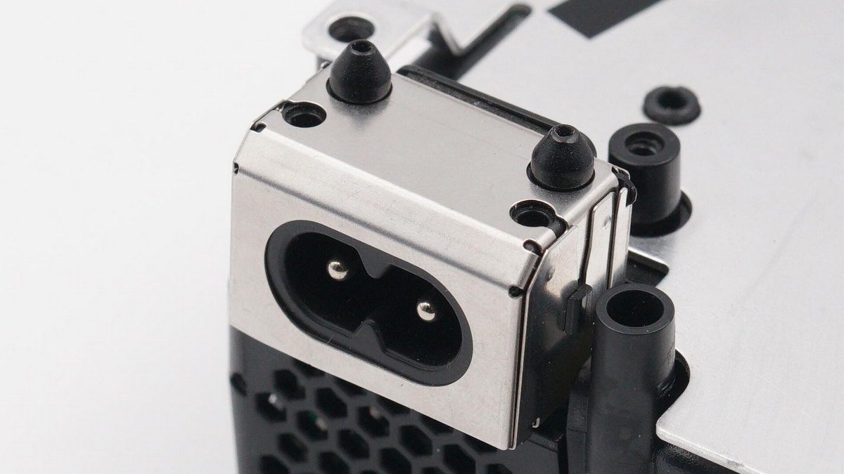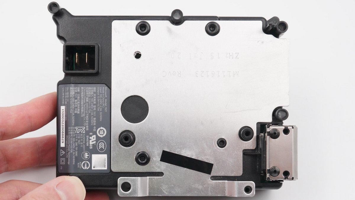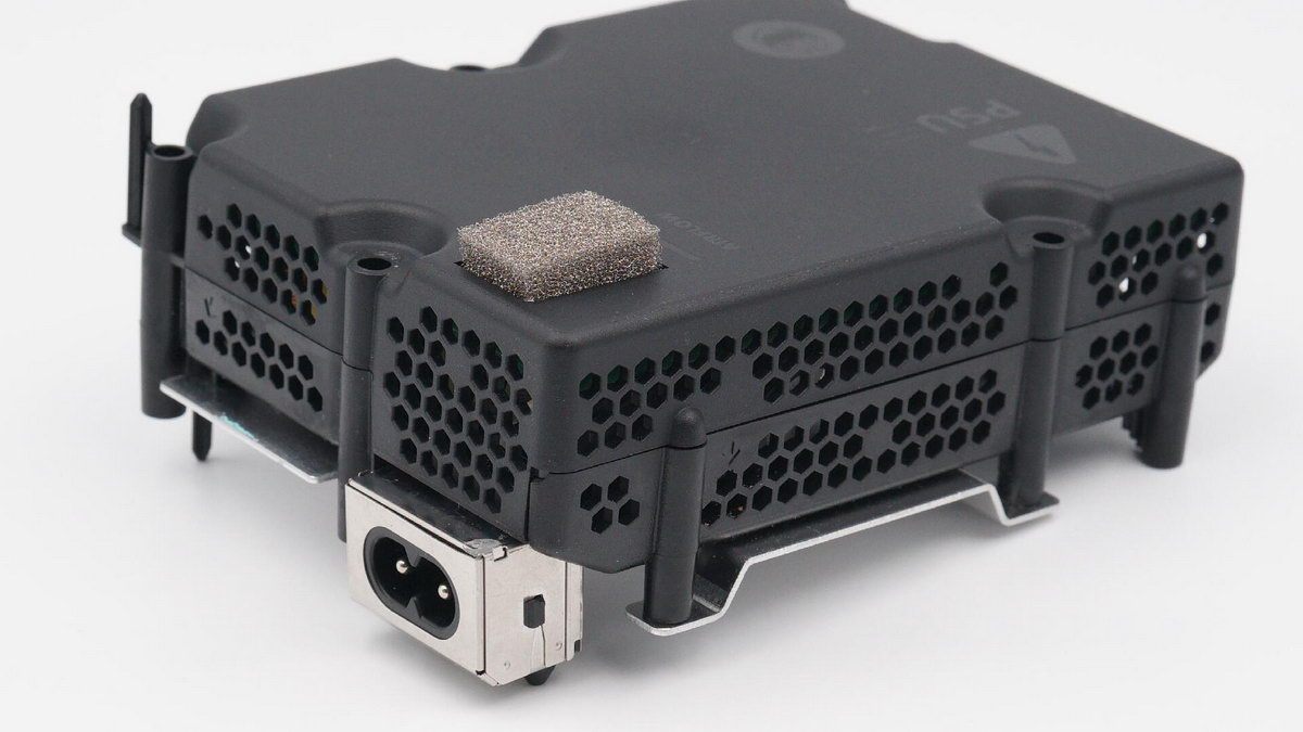微软Xbox Series S主机采用扁平长方体造型设计,自然对内部器件的尺寸要求就很苛刻,电源扁平规则机身造型设计就能很好体现这一点。电源外壳采用质轻且强度好的工程塑料,其中一面覆盖金属散热板,侧身四面设计散热孔全方位散热。