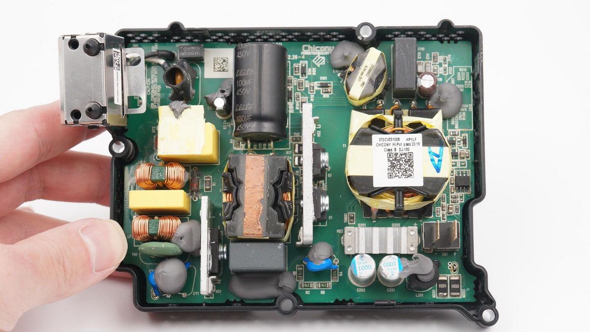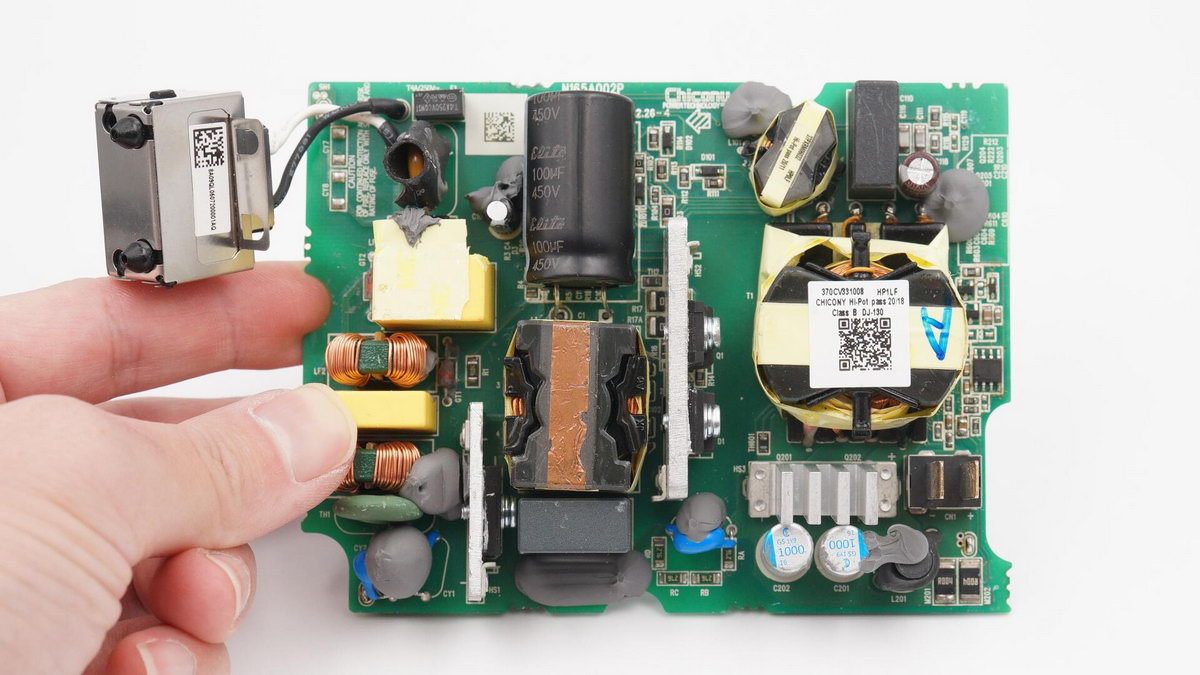 充电头网通过拆解发现,这款电源采用PFC+LLC的高性能电源架构设计,设有输出插脚固定12V电压输出。PFC升压电路采用恩智浦TEA19162搭配意法MOS管组成。LLC开关电源同步整流控制器采用MPS MP6924A,MOS管来自AOS和意法。金山电解电容以及固态电容进行输入输出滤波。整体来看,电源的用料做工都是相当不错的。
