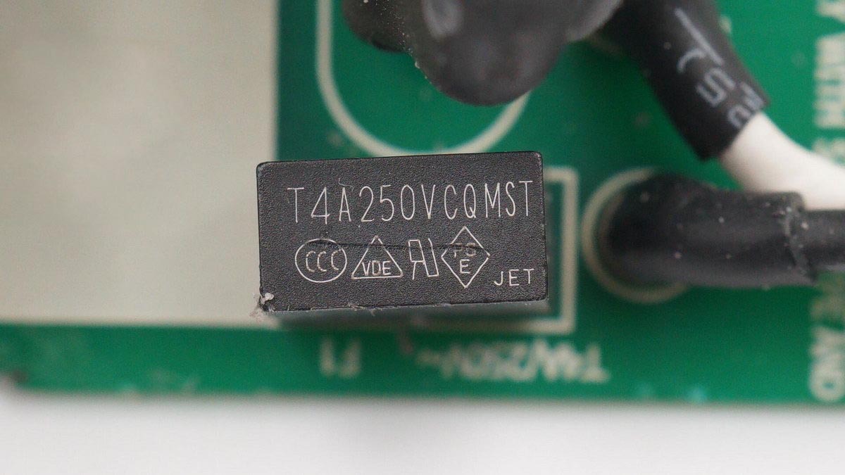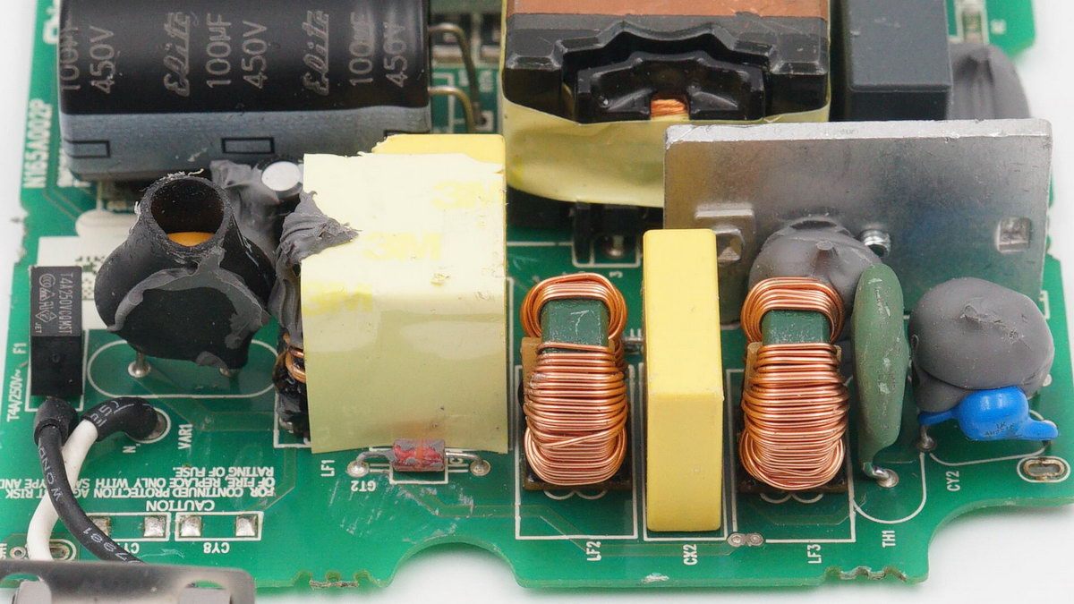 主板前端设有输入EMI滤波电路,压敏电阻外套绝缘管,NTC浪涌抑制电阻和Y电容打胶,还设有两颗安规X电容和三颗共模电感,左侧安规X电容包裹绝缘胶带。