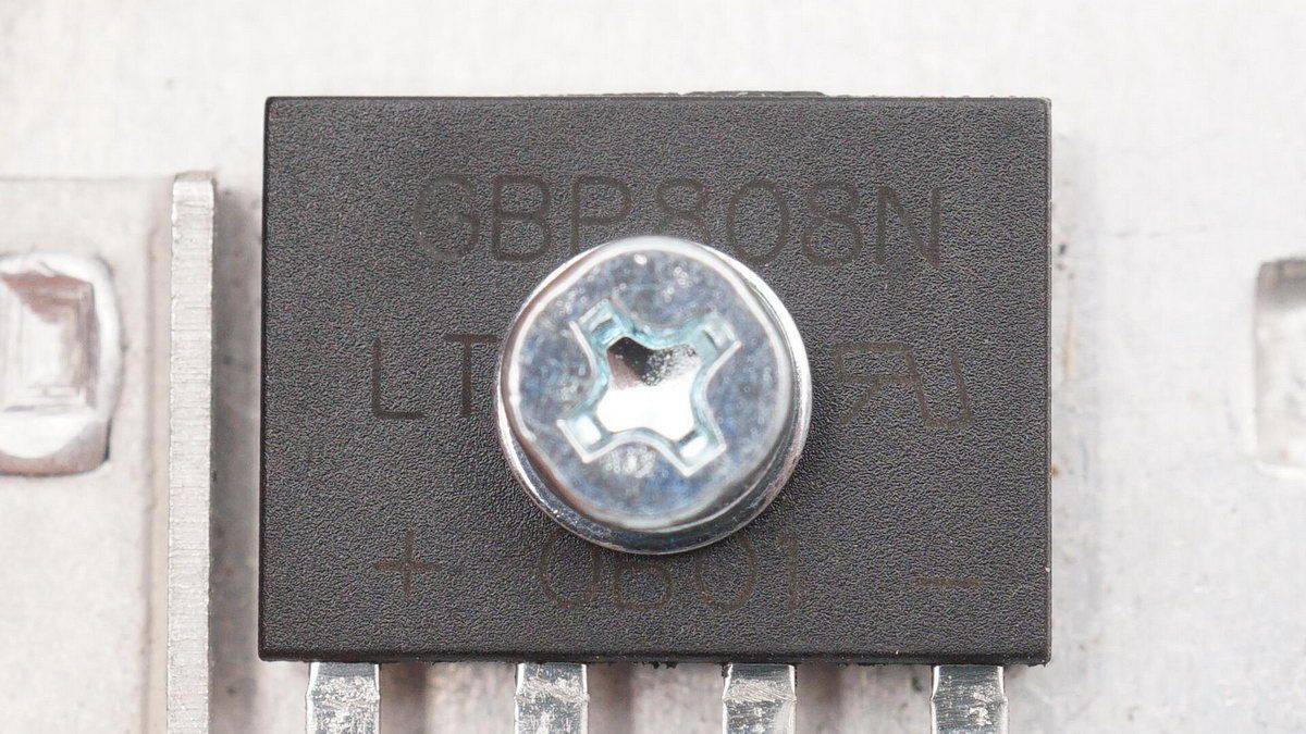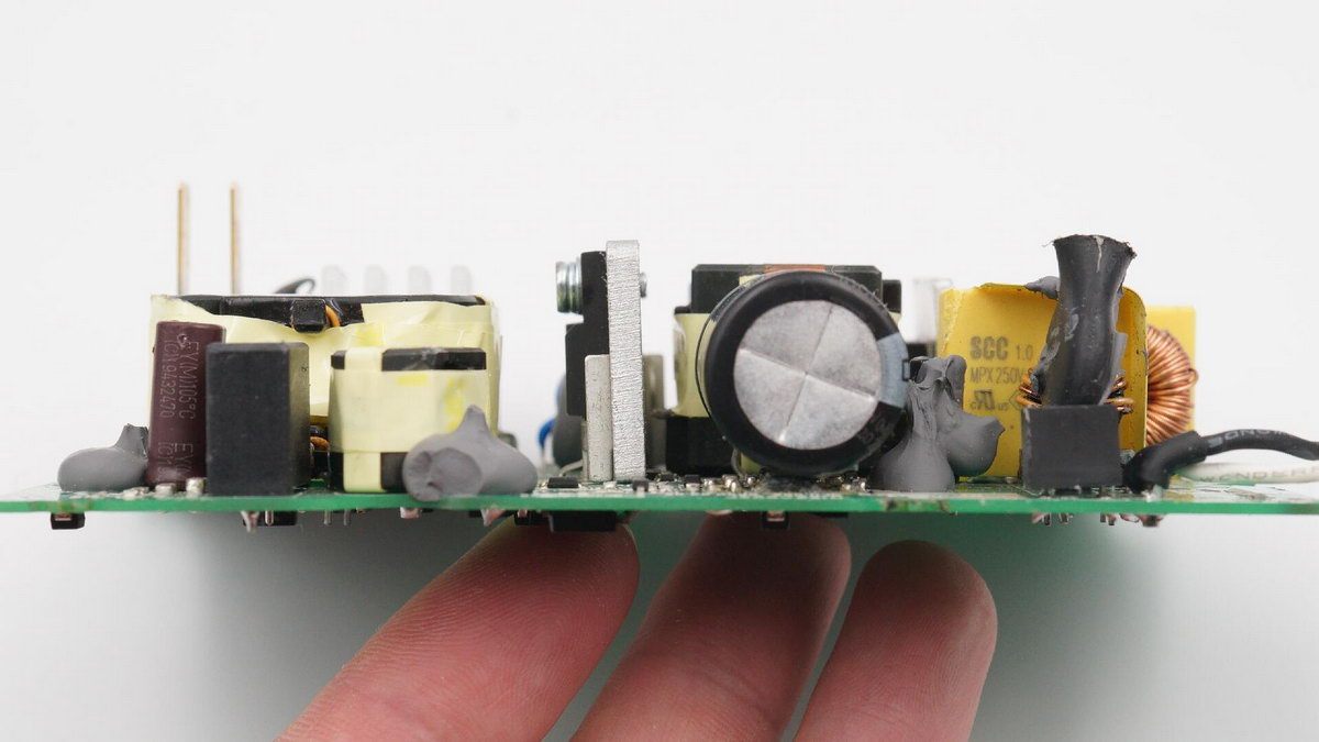 模块侧面一览,左边设有整流桥,滤波电容、PFC升压电感,中间有一颗Y电容,右边设有滤波固态电容和滤波电感。