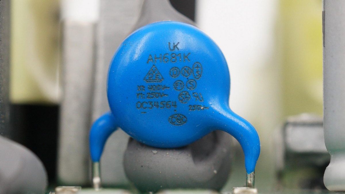 第二颗安规X电容容量0.47μF,两侧各有一颗共模电感,绿色NTC浪涌抑制电阻用于抑制上电浪涌电流。