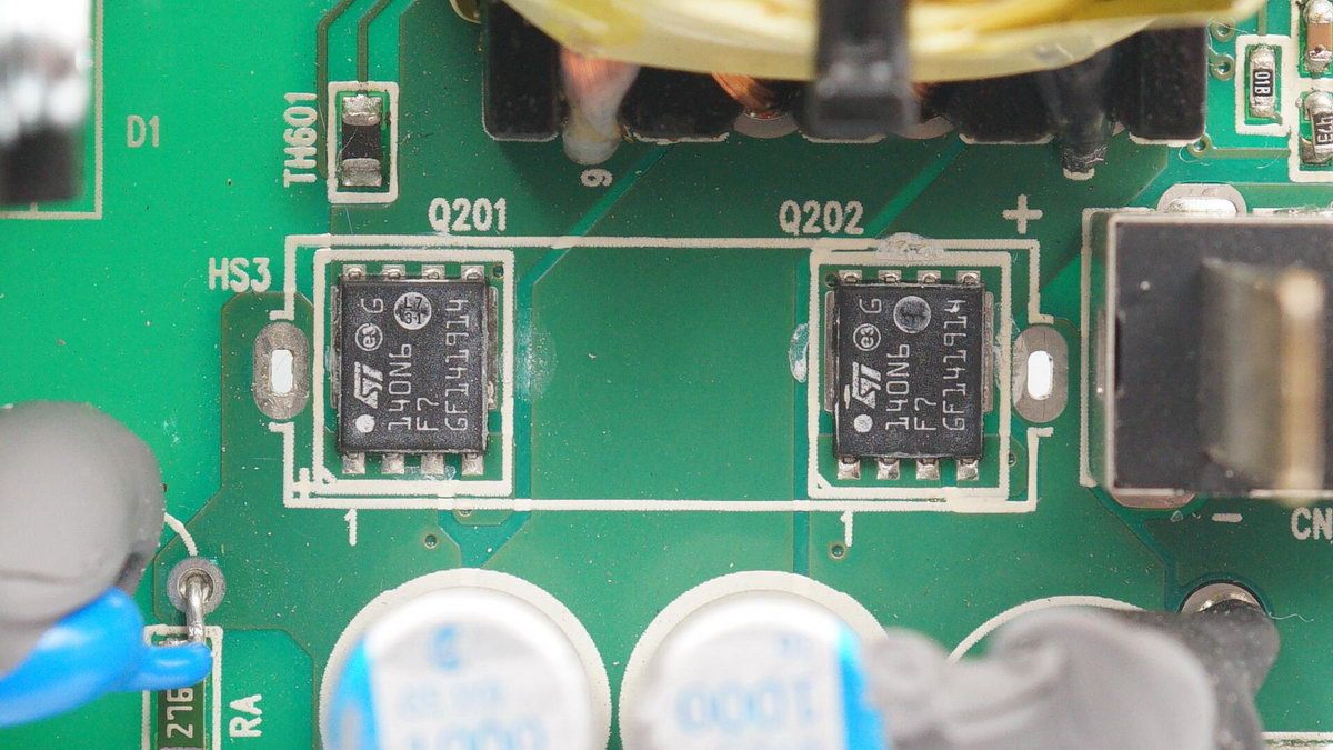 两颗同步整流管采用意法STL140N6F7,耐压60V,导阻2.8mΩ,PowerFLAT™ 5x6封装,用于进行LLC同步整流。