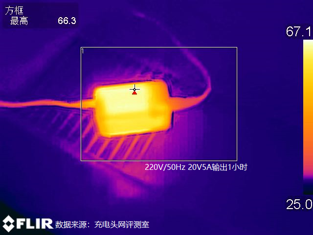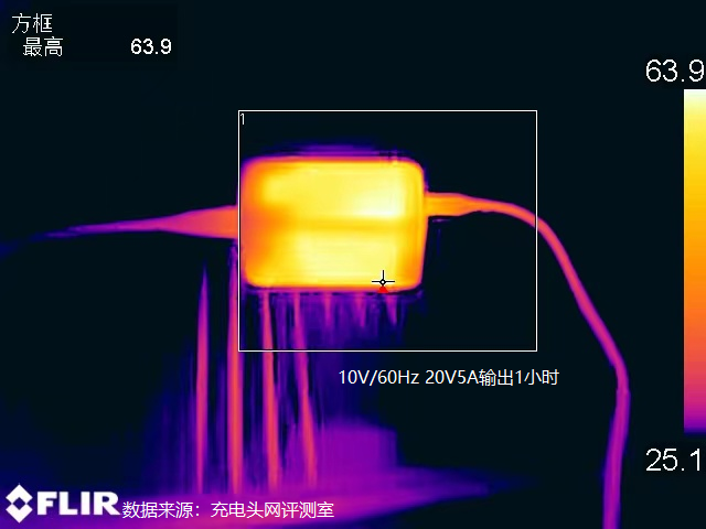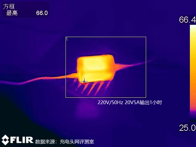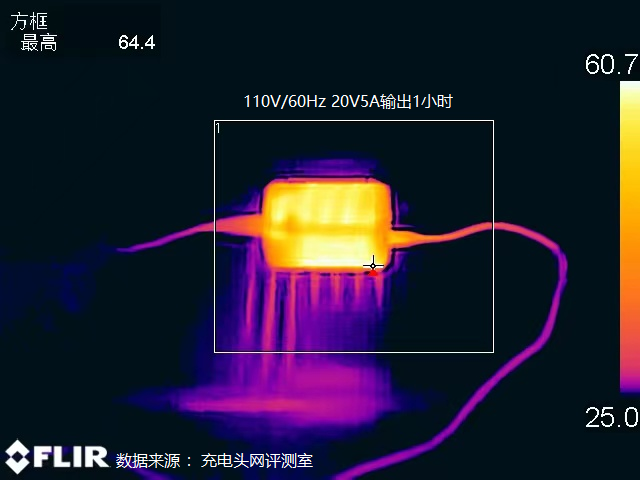 前面提到充电器工作时会涉及到效率转换的问题,其中的损耗电量绝大多数以热量散发,所以充电器长时间工作的发热情况也是测试的重要一环。让充电器以100W功率持续输出一小时,采集充电器表面温度,实验全程将充电器置于25°C恒温箱当中。