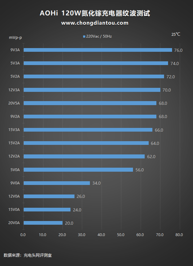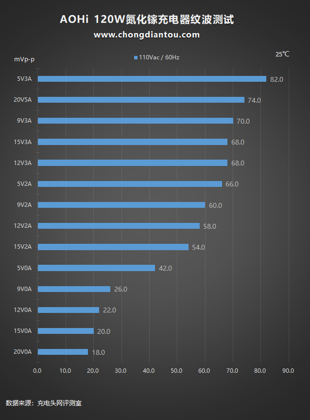 110V 60Hz下,最高为82mVp-p,充电器处于5V3A输出状态;最低为18mVp-p,充电器处于20V0A空载状态。