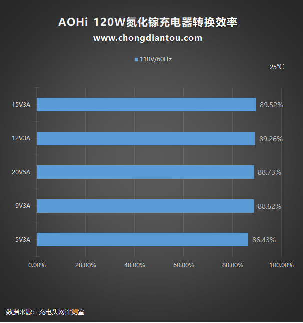 110V 60Hz下,充电器的转换效率从86.43%到89.52%不等。