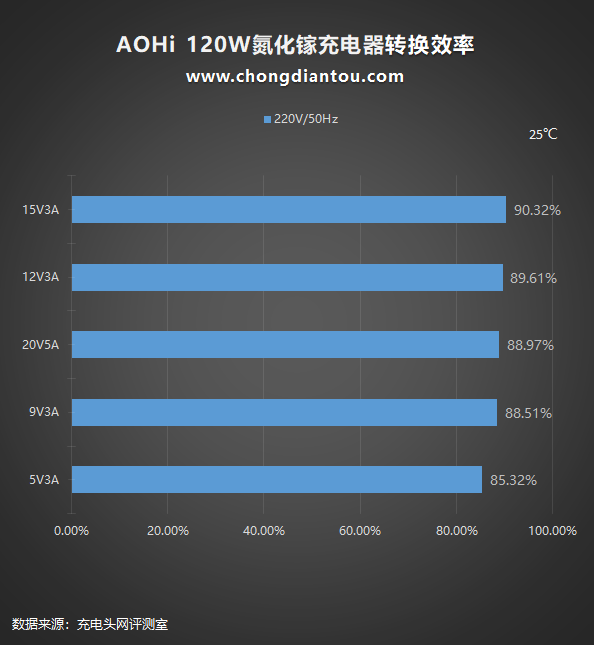 充电器本质上是一种转换设备,过程中会有损耗,以热量的形式散发出来。我们平时看充电器上面的参数输出100W或者65W是充电器可以为设备提供的最大输出功率,但充电器从插座上汲取的功率往往要更大一些,下面是充电器在220V 50Hz和110V 60Hz交流输入的情况下分别进行了转换效率测试,测试结果如下: